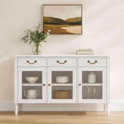Mueble de televisión en color blanco fabricado en MDF lacado, combinado con metal.