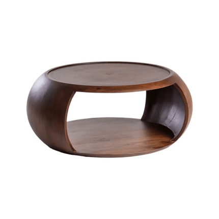 Mesa de centro en color beige y marrón fabricada en mármol, combinado con madera de mango.