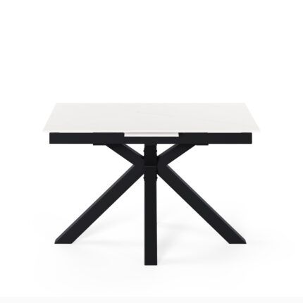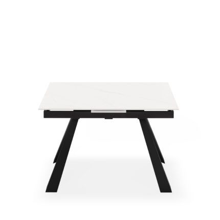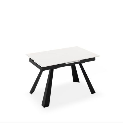 Mesa de comedor extensible en color blanco y negro fabricada en porcelánico, combinado con metal.