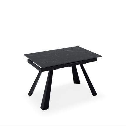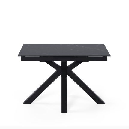 Mesa de comedor extensible en color negro fabricada en porcelánico, combinado con metal.