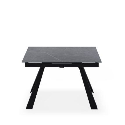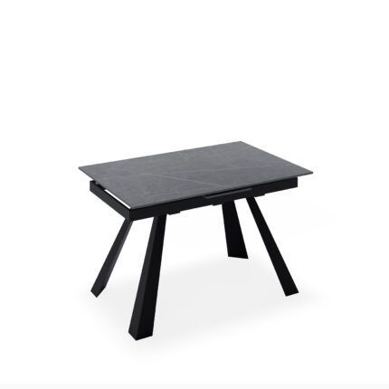 Mesa de comedor extensible en color gris y negro fabricada en porcelánico, combinado con metal.