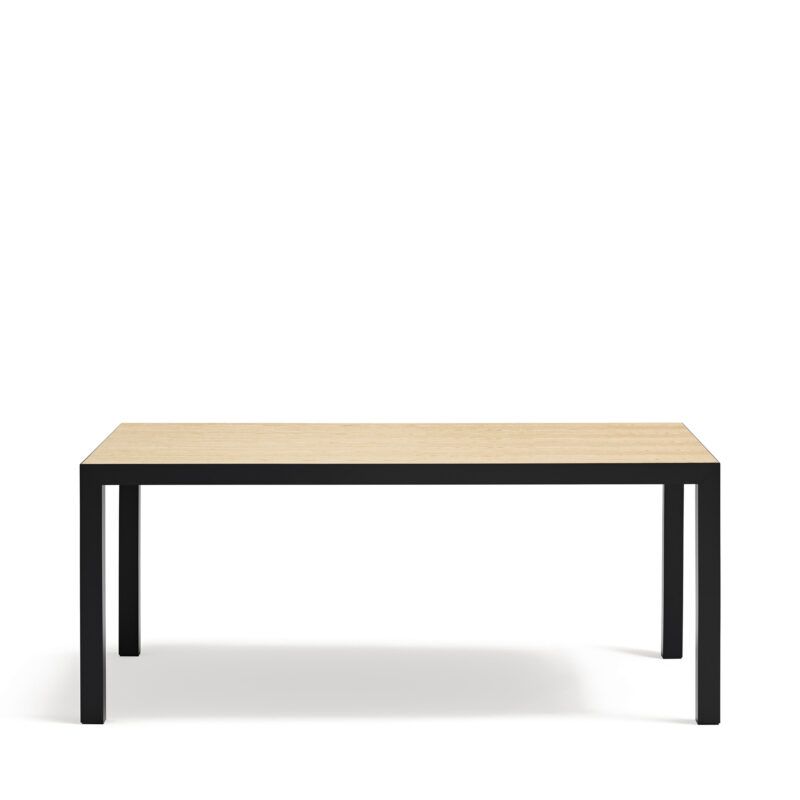 Mesa de comedor en color roble y negro fabricada en chapa de roble, combinado con metal.