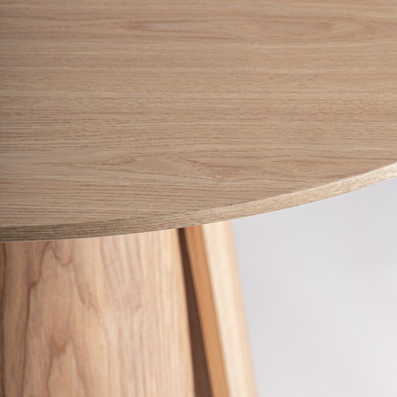 Mesa de comedor redonda en color marrón claro fabricada en mdf, combinado con chapa de fresno.