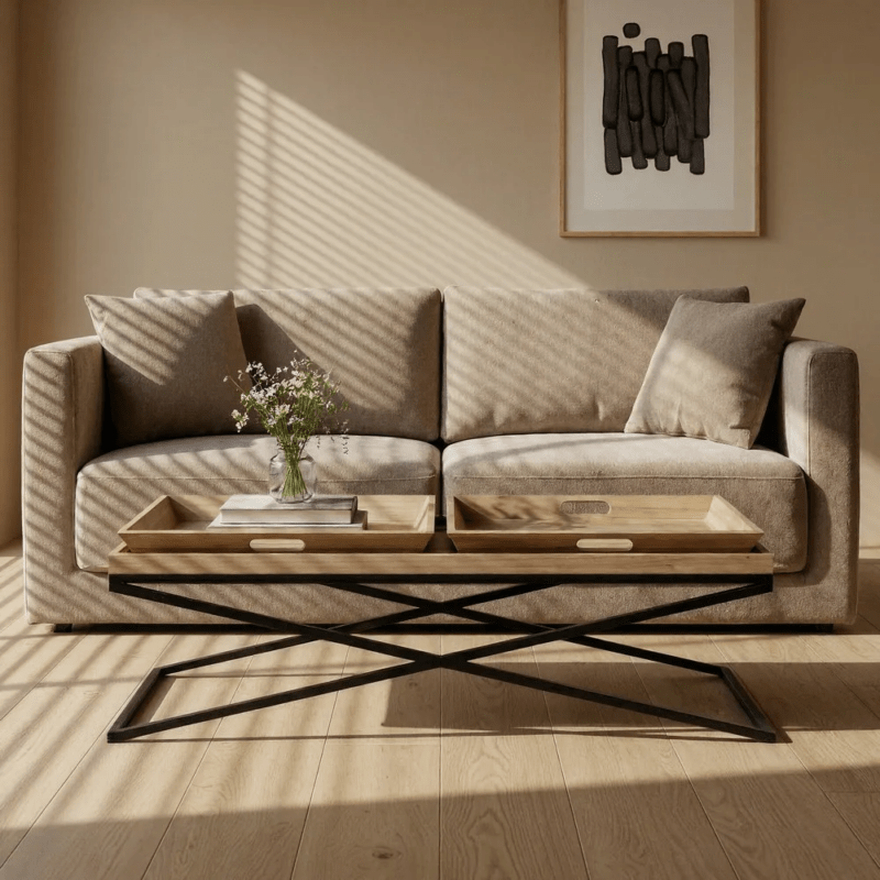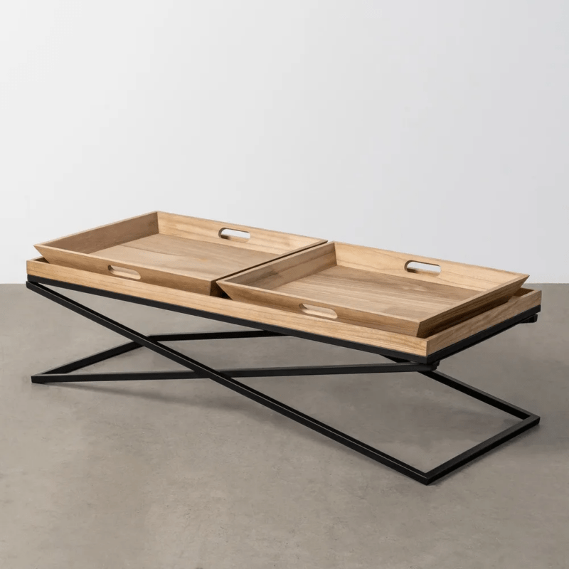 Mesa de centro en color natural y negro fabricada en mdf, combinado con hierro.
