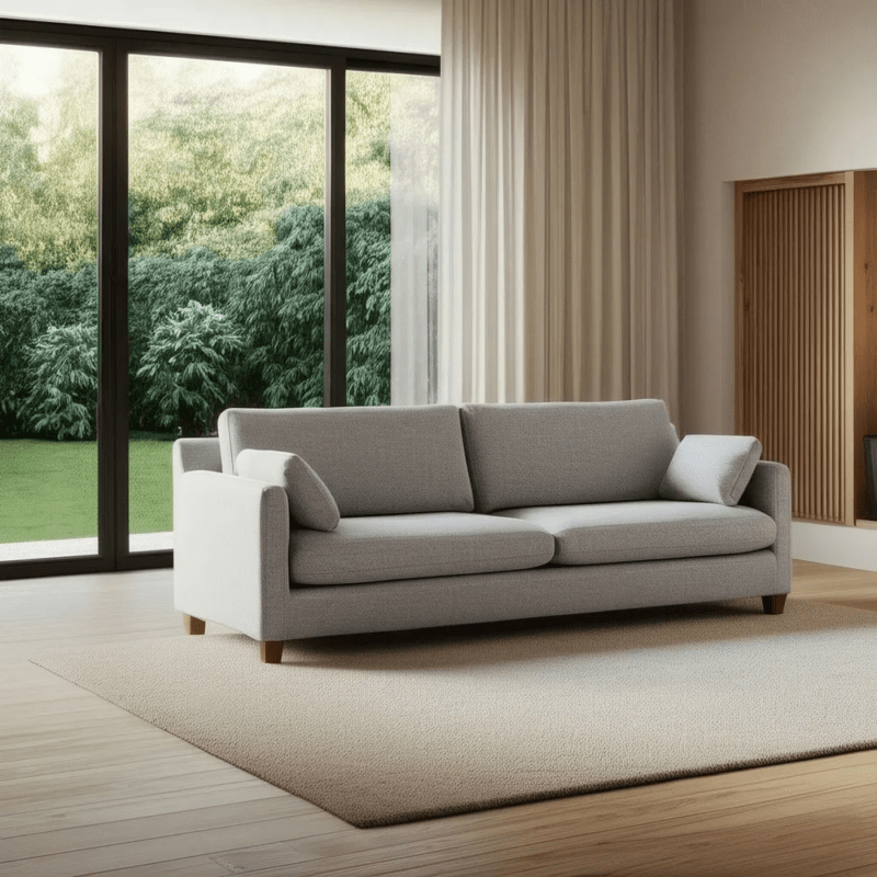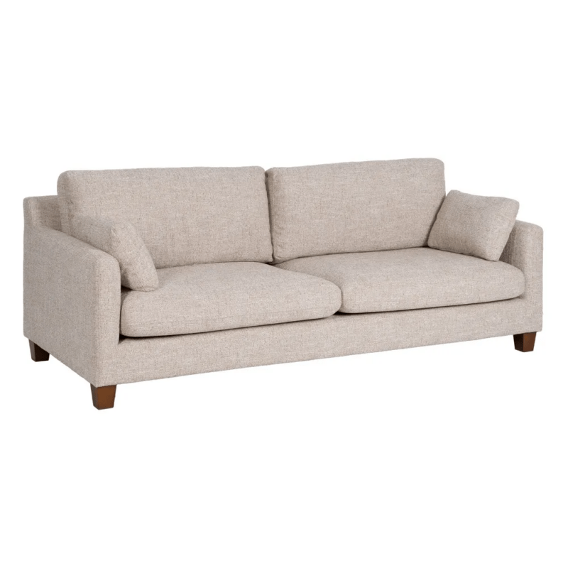 Sofá en color natural fabricado en tela, combinado con pino macizo y aglomerado.