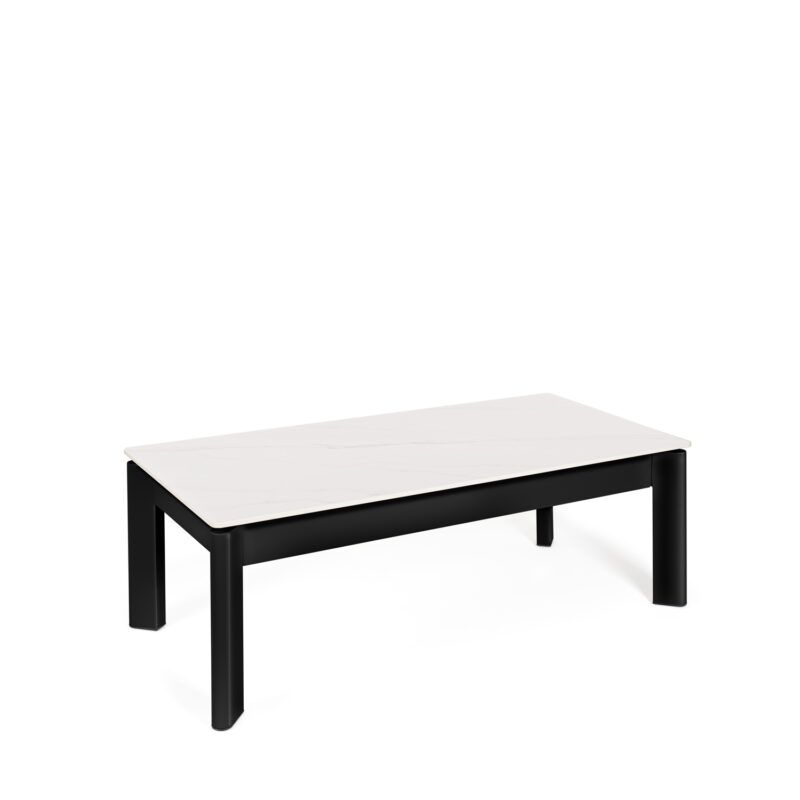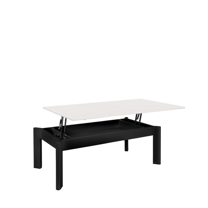 Mesa de centro elevable en color blanco y negro fabricada en porcelánico, combinado con metal.