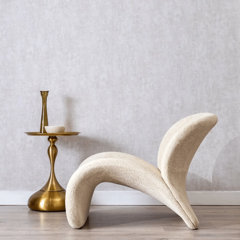 Sillón en color beige fabricado en tela, combinado con hierro y madera contrachapada.