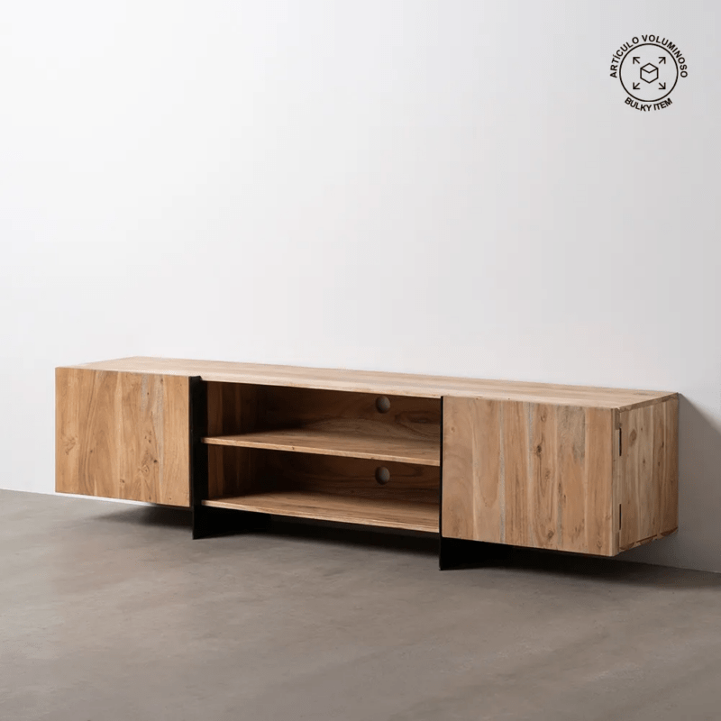Mueble de televisión en color natural fabricado en madera de acacia, combinado con hierro.