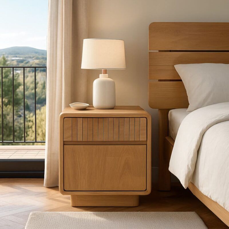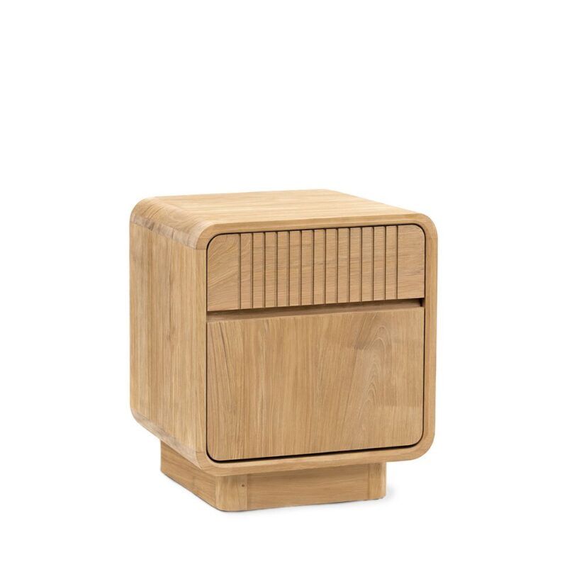 Mesita de noche en color natural fabricada en madera de teca.