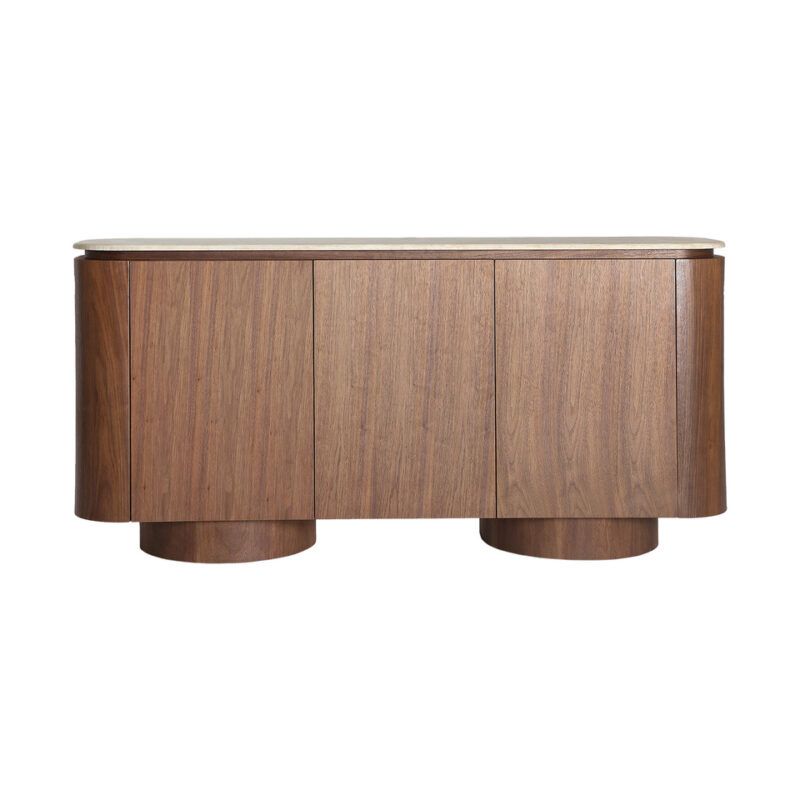 Aparador en color marrón y beige fabricado en chapa de nogal, combinado con mdf y mármol sintético.