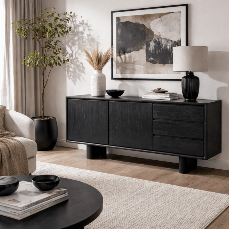 Aparador en color negro fabricado en madera de mango, combinado con mdf.
