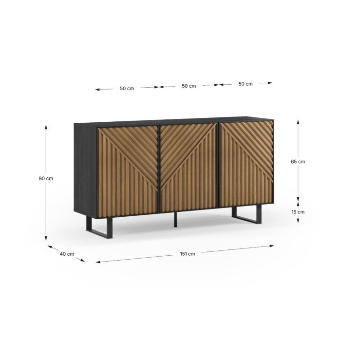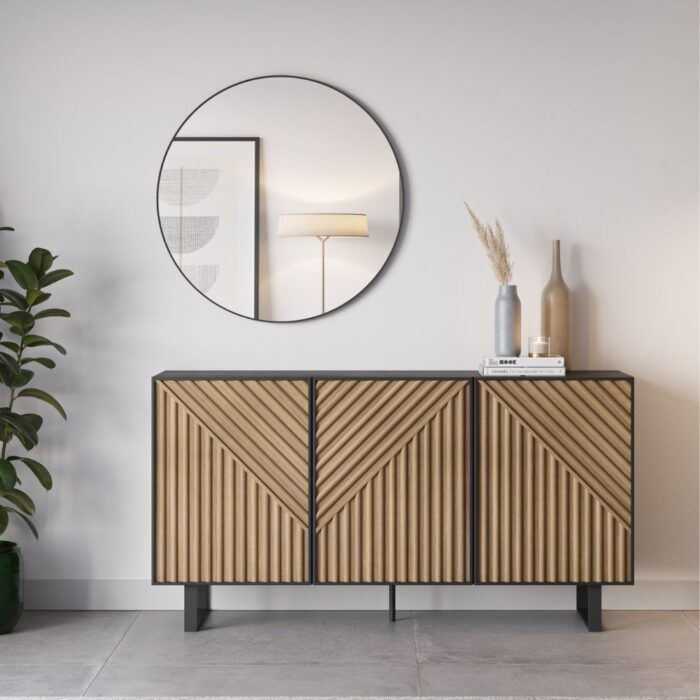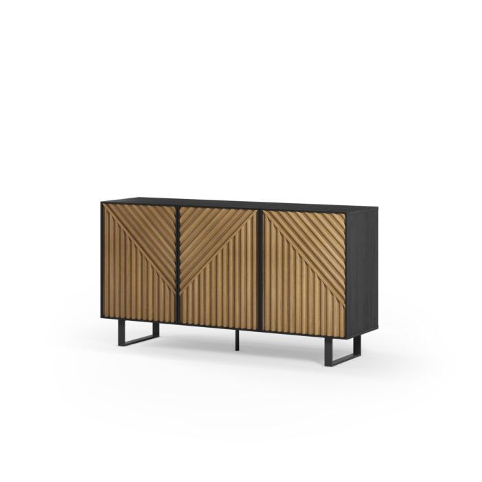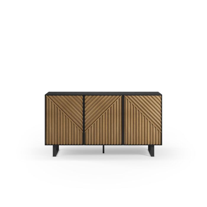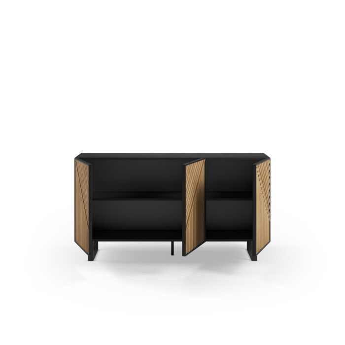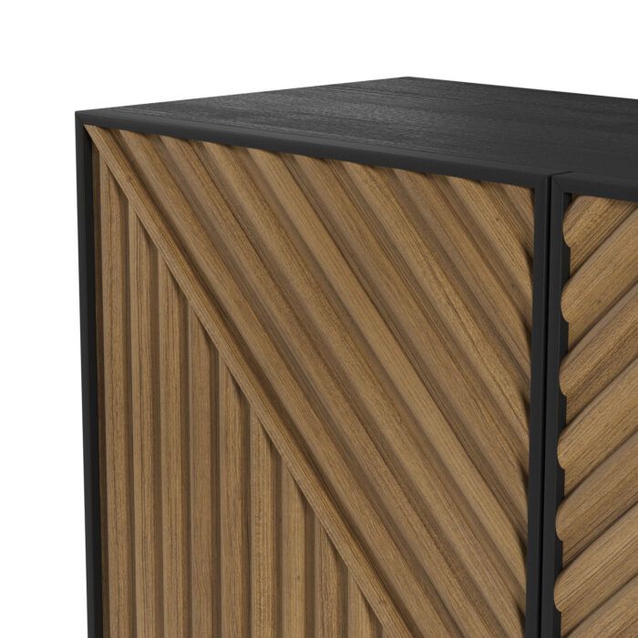 Su acabado en color negro y roble natural aporta un contraste cálido y sofisticado, ideal para salones, comedores o recibidores modernos. Las puertas con relieves geométricos en diagonal le dan un toque distintivo y actual, convirtiéndolo en una pieza decorativa por sí misma.