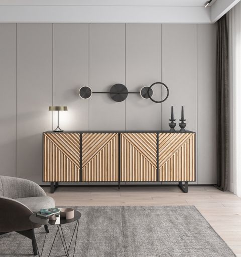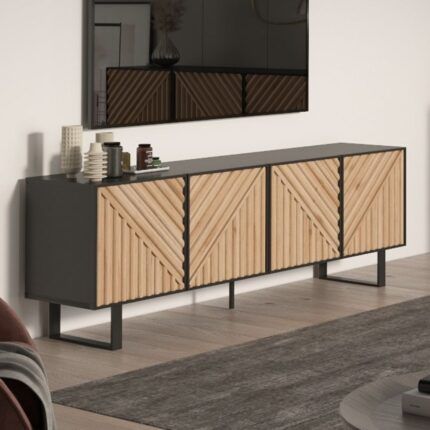 Su elegante acabado en color negro y roble natural aporta un contraste moderno y cálido, ideal para realzar cualquier estancia del hogar. Las puertas con relieves geométricos en diagonal otorgan un toque distintivo y artesanal, convirtiéndolo en un punto focal decorativo.