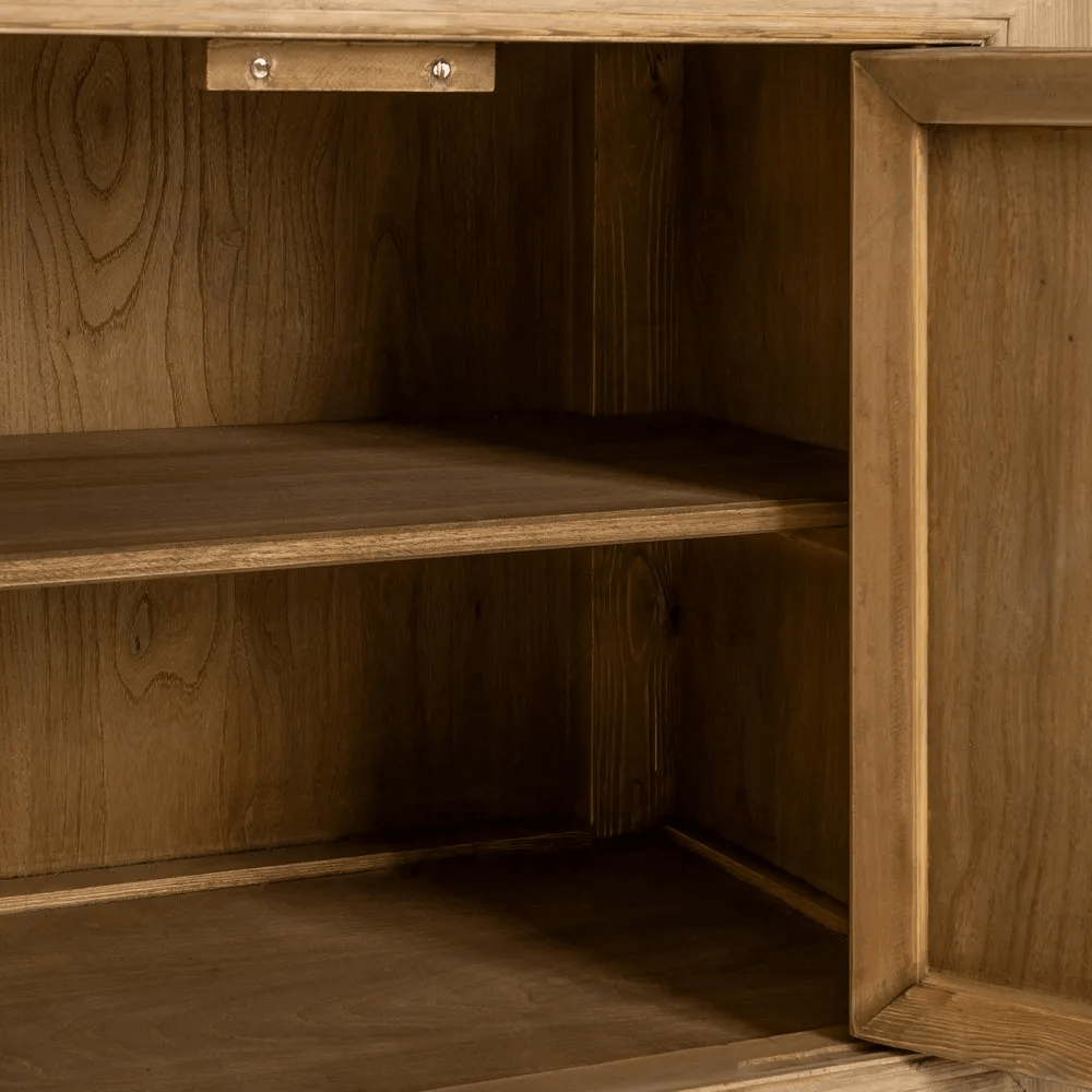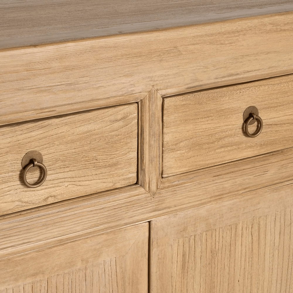 Sus patas de 8 cm de altura aportan ligereza visual y facilitan la limpieza, mientras que su estructura sólida garantiza resistencia y durabilidad. Gracias al uso de madera reciclada, este aparador no solo destaca por su estética y funcionalidad, sino también por su compromiso con el medio ambiente.