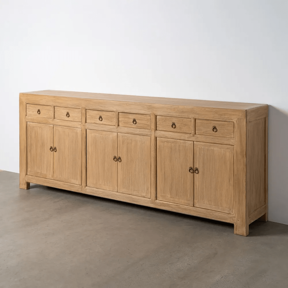 Aporta calidez, funcionalidad y estilo a tu hogar con este elegante aparador en color natural fabricado en madera de pino reciclada, una pieza que combina sostenibilidad y diseño atemporal.