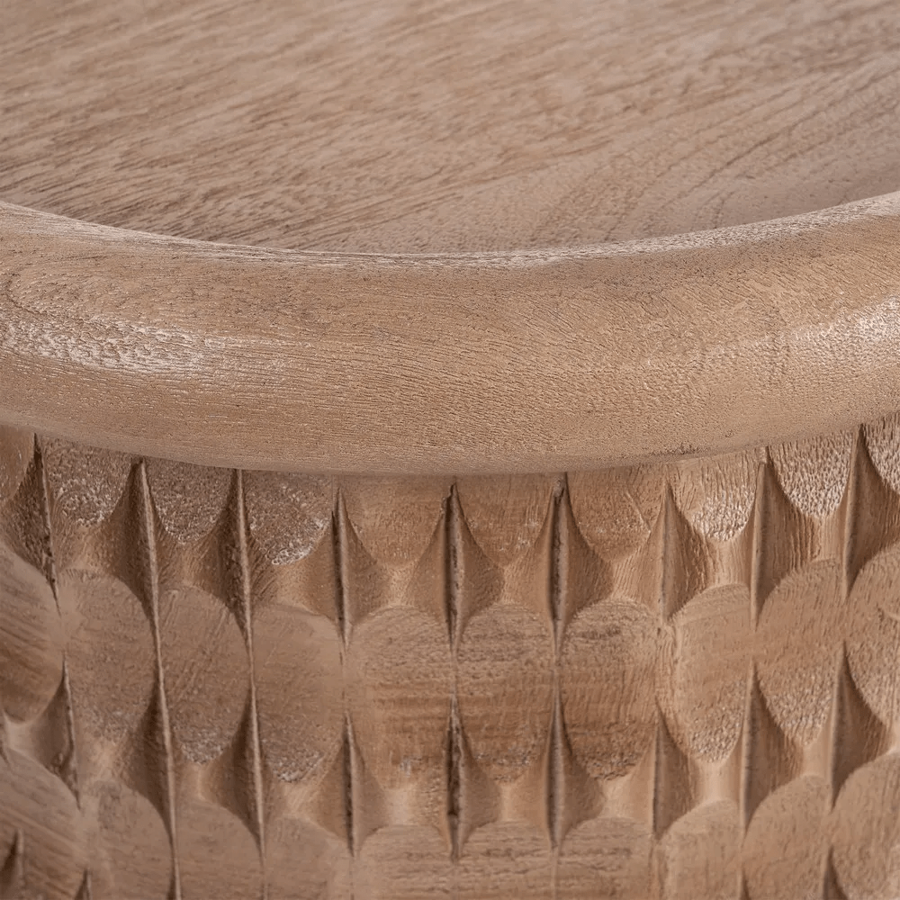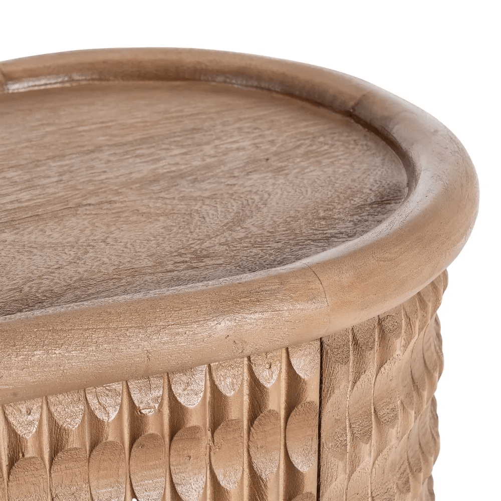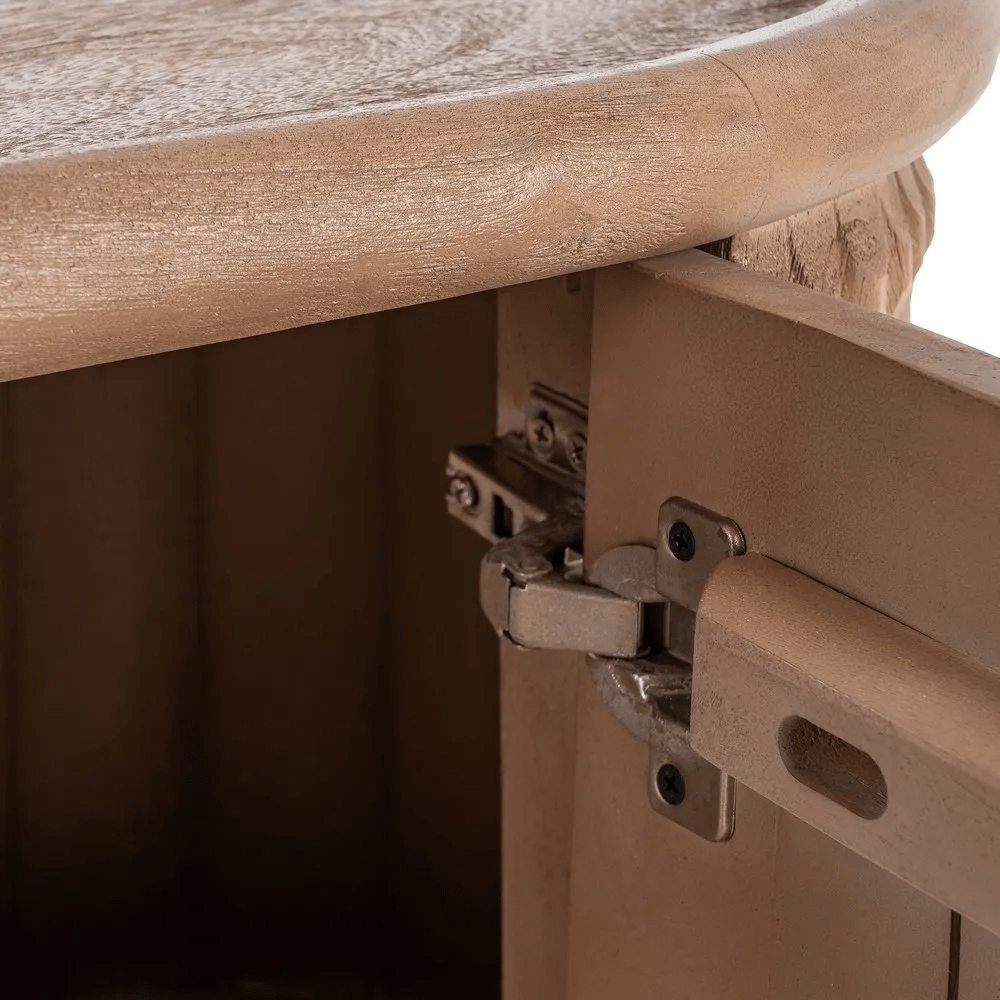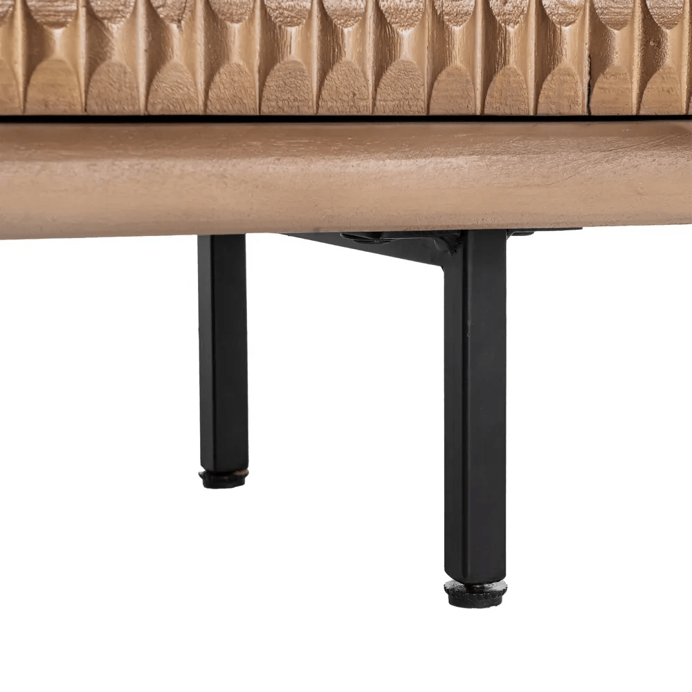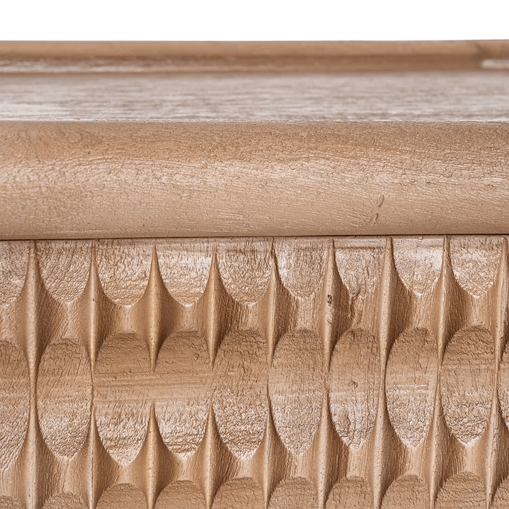 Este aparador destaca por su diseño artesanal y su silueta orgánica. Fabricado en madera de mango maciza, ofrece una estética natural y contemporánea perfecta para cualquier espacio. Su superficie suavemente curvada y el relieve tallado a mano aportan textura y movimiento visual, mientras que las patas de hierro elevan la pieza con un toque de ligereza industrial.