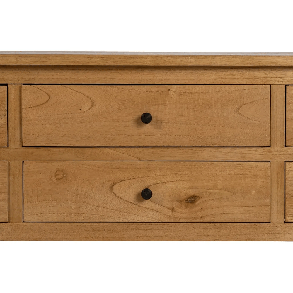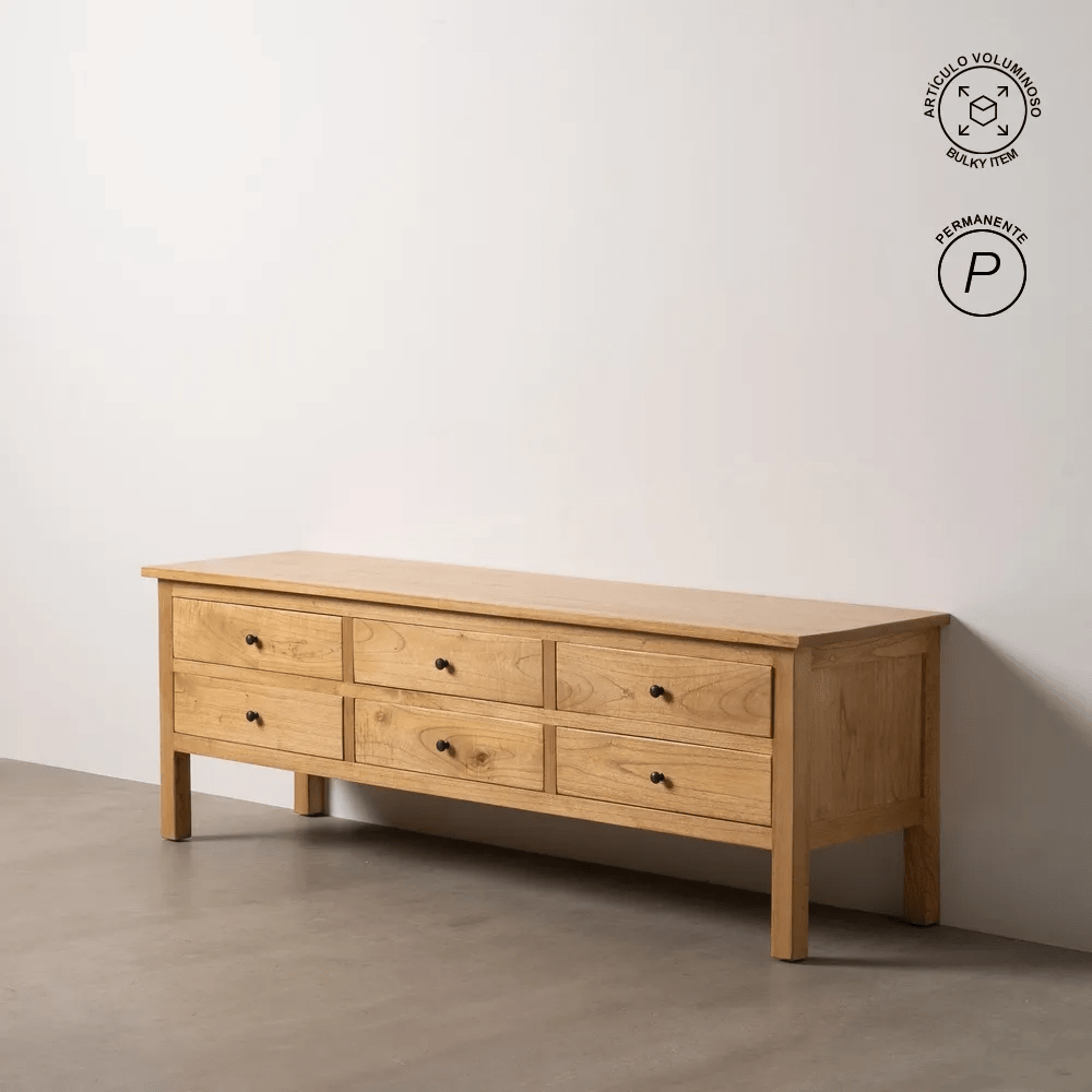 Con unas medidas totales de 180 x 48 x 60 cm, este mueble ofrece una amplia capacidad de almacenamiento gracias a sus seis cajones de 53 x 13,5 cm, ideales para mantener el orden en el salón, comedor o recibidor. Las patas de 20 cm de altura le proporcionan ligereza visual y facilitan la limpieza del espacio inferior.