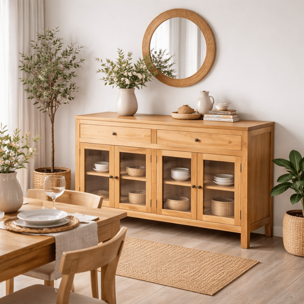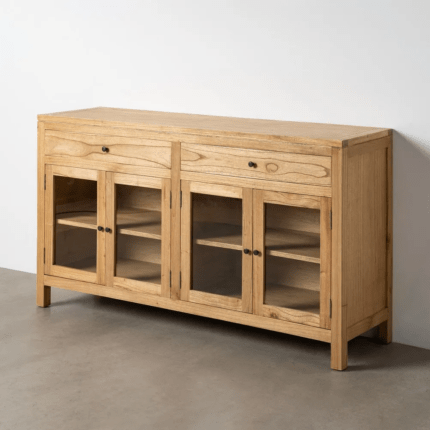 Aparador en color natural fabricado en madera de mindi, combinado con cristal.