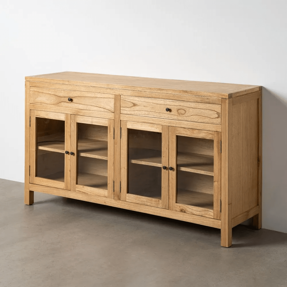 Aparador en color natural fabricado en madera de mindi, combinado con cristal.