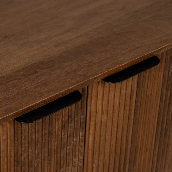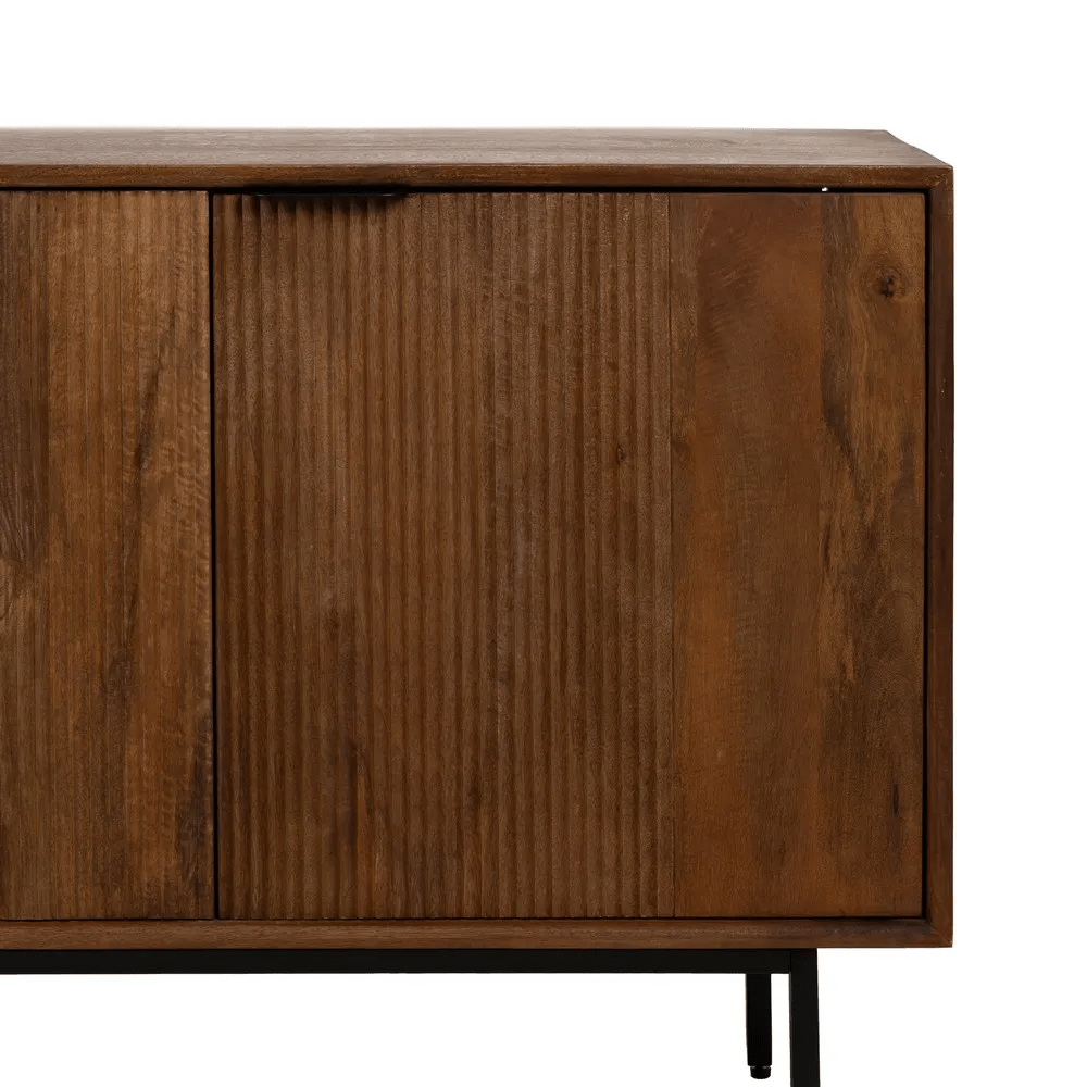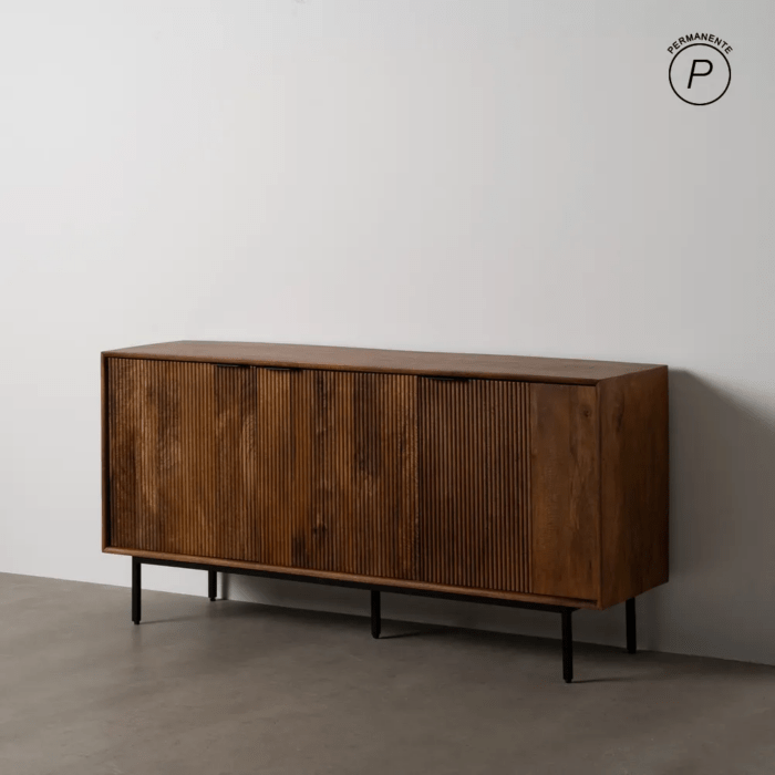 Con unas medidas totales de 160 x 40 x 78 cm, ofrece un equilibrio perfecto entre funcionalidad y presencia decorativa. Dispone de tres puertas acanaladas de 52,5 x 55 cm cada una, que ocultan amplios compartimentos interiores ideales para organizar vajilla, libros u objetos personales. Las patas metálicas de 18 cm de altura elevan el mueble, proporcionando ligereza visual y facilitando la limpieza del suelo.