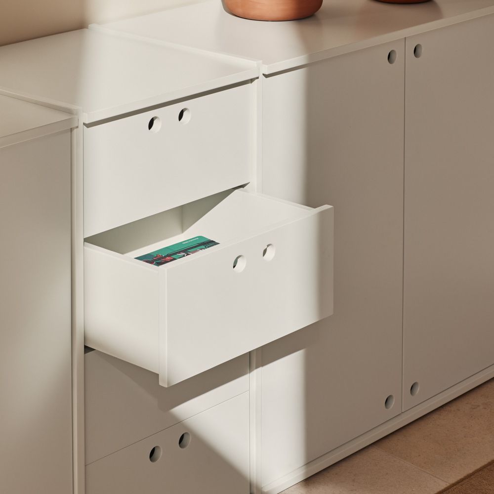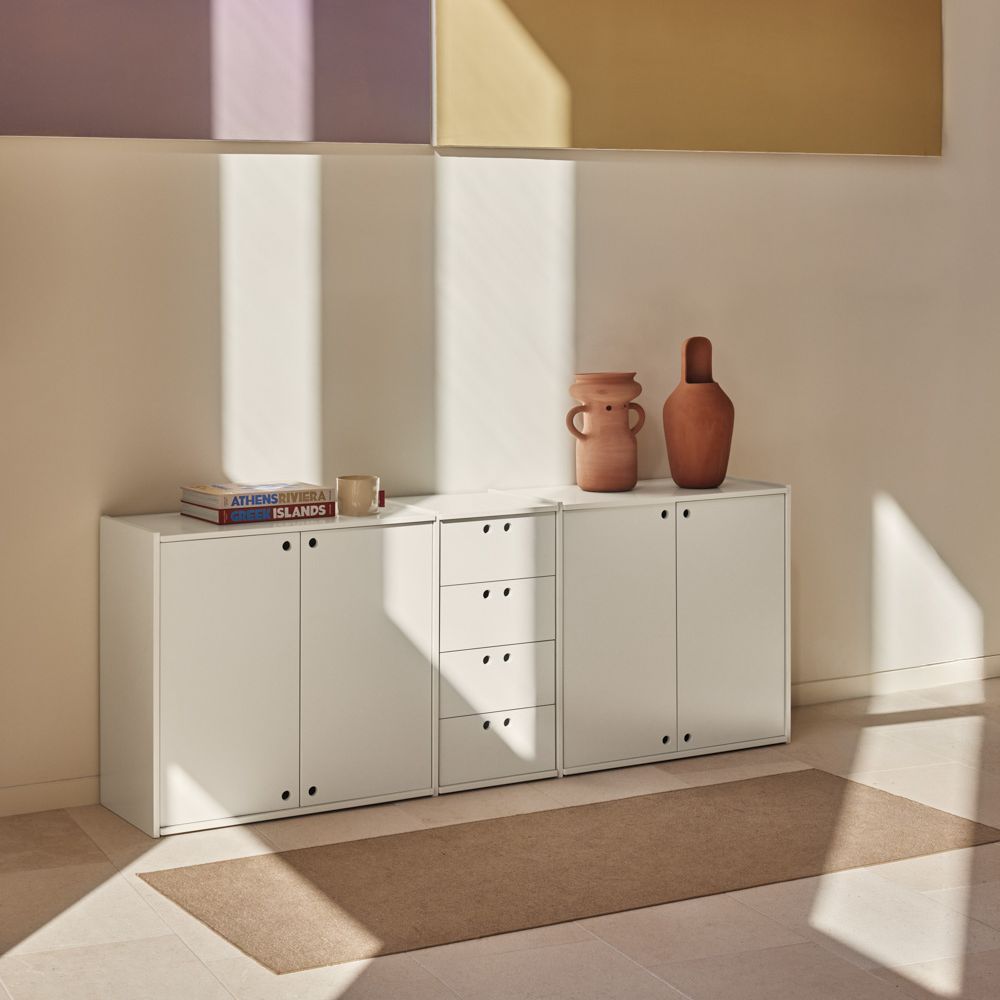 MDF visto como material de la colección. Agujeros en lugar de pomos. Superficies divisibles para facilitar el transporte y el empaquetado.