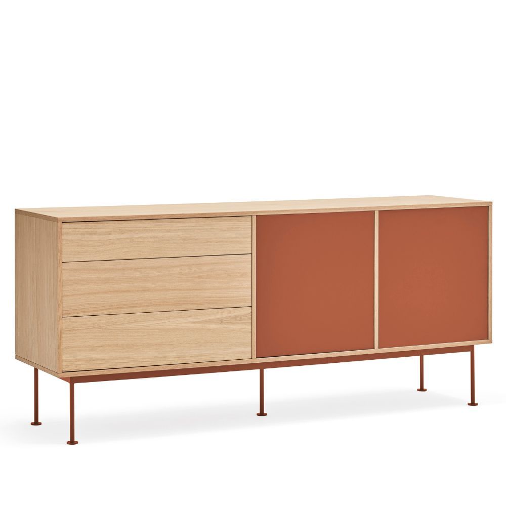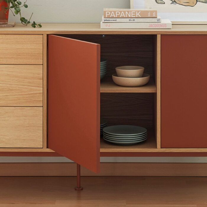 Aparador en color teja y roble fabricado en MDF lacado, combinado con chapa de roble y metal.