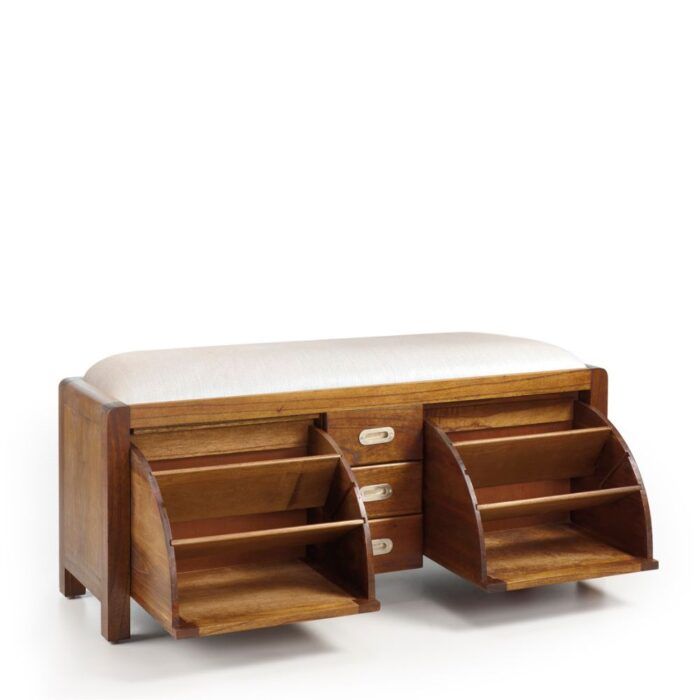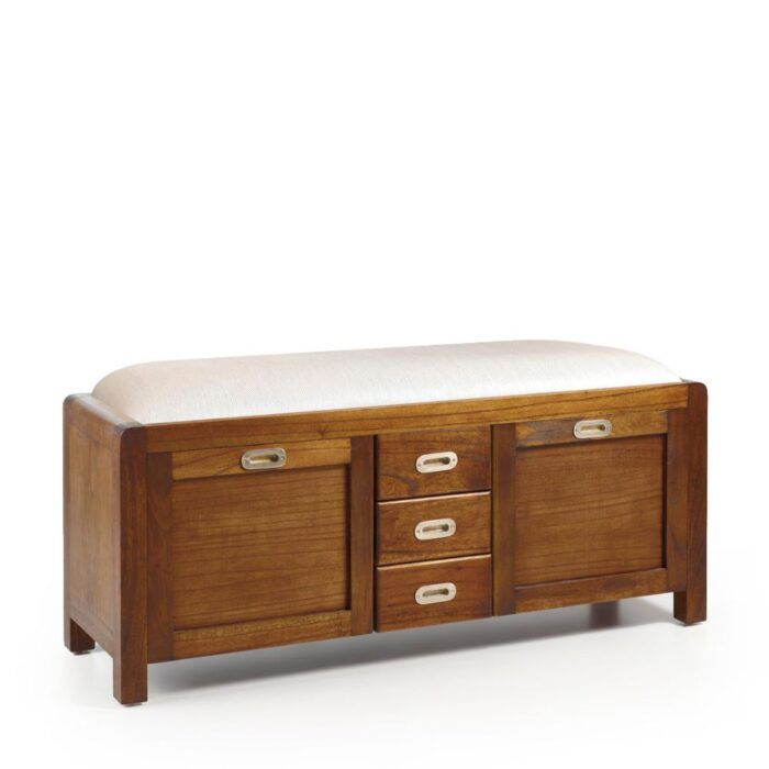 Colección que combina el diseño colonial con un toque moderno. Sus líneas depuradas y detalles sencillos añaden un toque de frescura al hogar. Banqueta con estructura en madera de mindi color marrón. Tiradores de bronce en color plata. Dispone de dos cajones abatibles para guardar los zapatos y otros tres para complementos de uso cotidiano. Combínala con el resto de muebles de la colección para crear el ambiente perfecto.