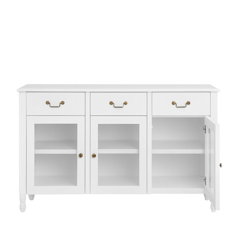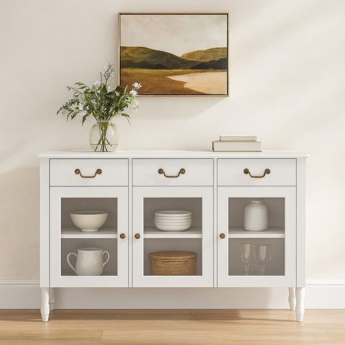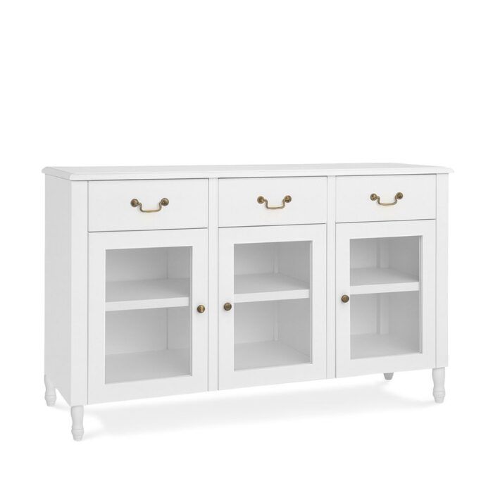 Su acabado blanco aporta luminosidad y un estilo refinado que se adapta fácilmente a cualquier ambiente, desde el más tradicional hasta el más moderno. Cuenta con 3 cajones y 3 puertas con vidrio, perfectos para organizar y exhibir vajilla, libros o elementos decorativos.