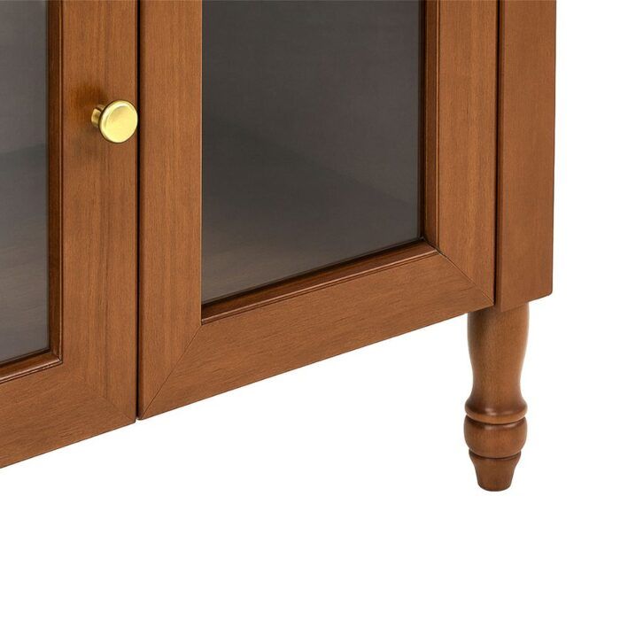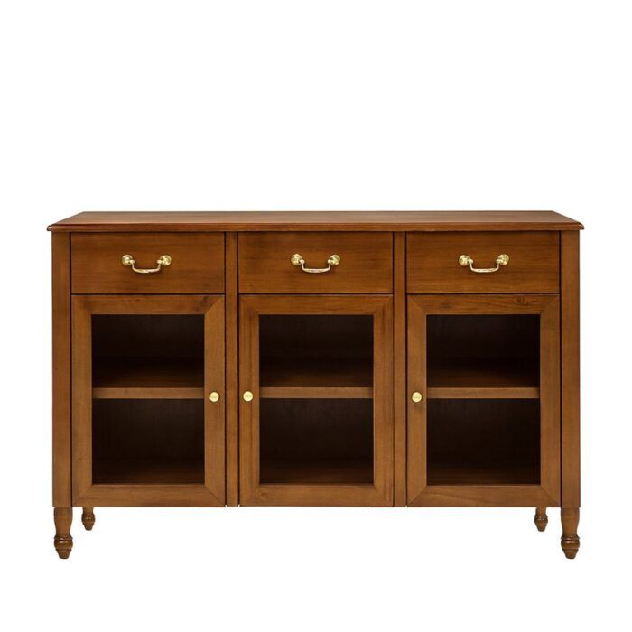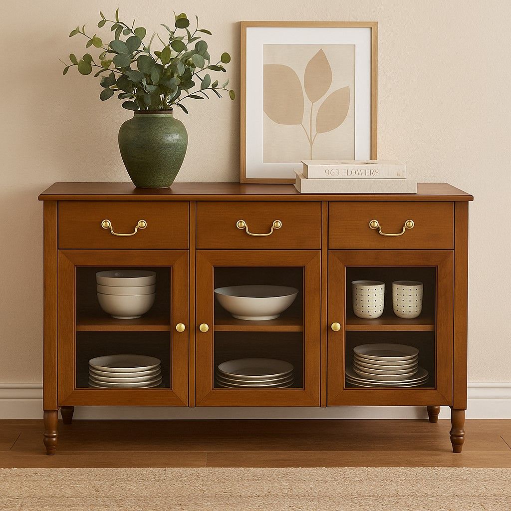 Su acabado en color marrón resalta los tonos cálidos de la madera, aportando carácter y sofisticación a cualquier espacio. Cuenta con 3 cajones y 3 puertas con vidrio, ideales para organizar y exhibir vajilla, libros o elementos decorativos.