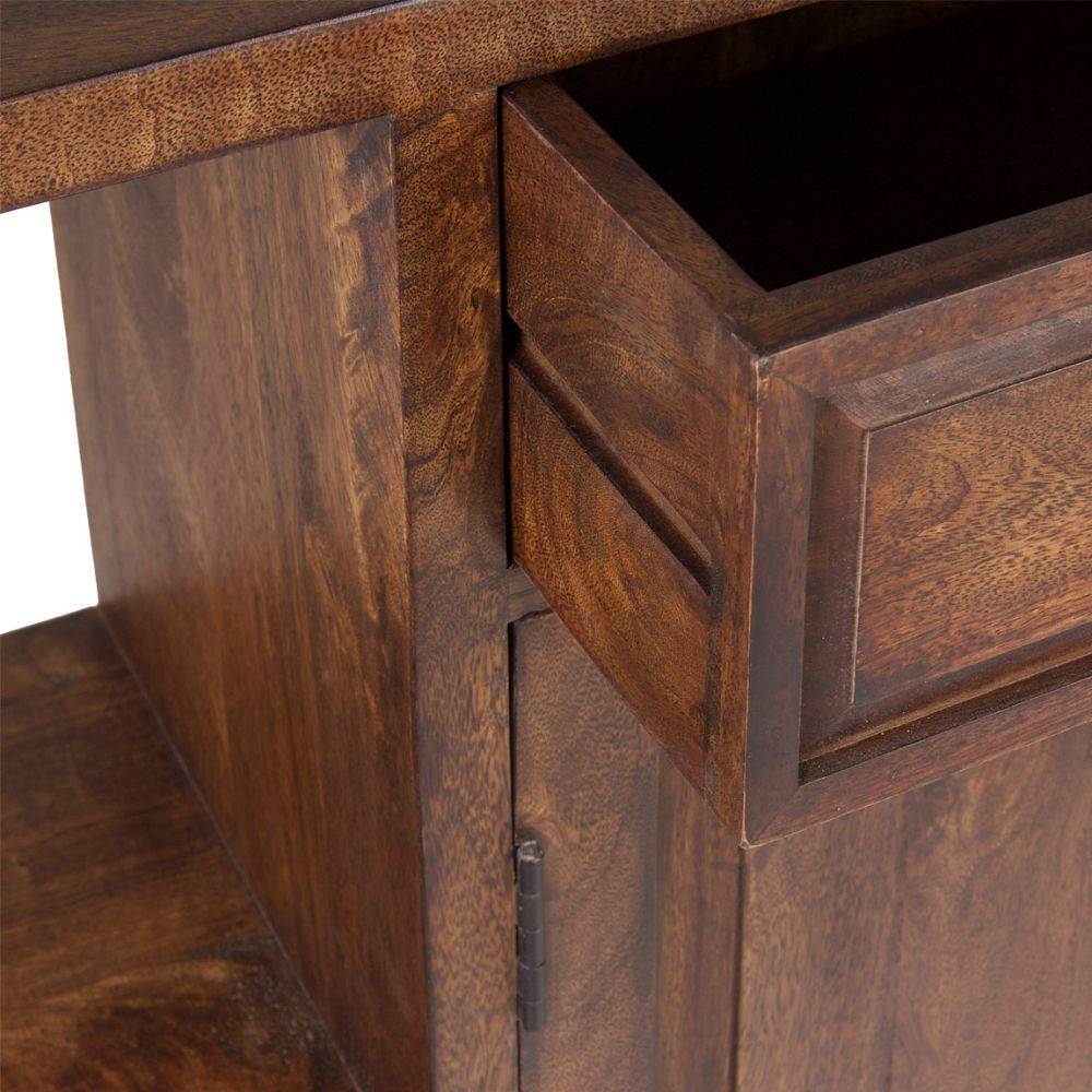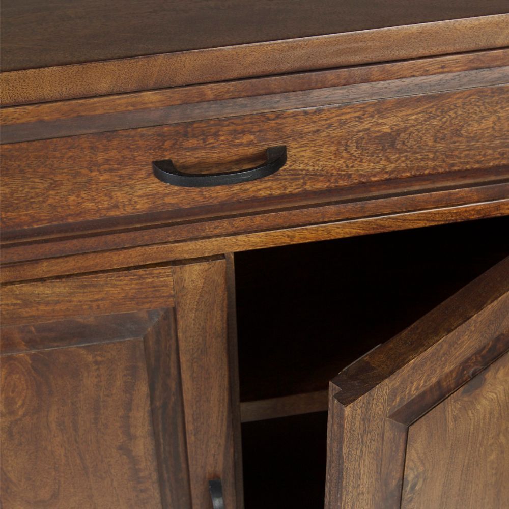 Dispone de un amplio cajón superior y dos puertas inferiores que ofrecen un generoso espacio de almacenaje, ideal para organizar vajilla, textiles, documentos u objetos decorativos. Sus estantes laterales abiertos refuerzan su diseño versátil, permitiendo exhibir piezas o mantener todo al alcance de la mano.