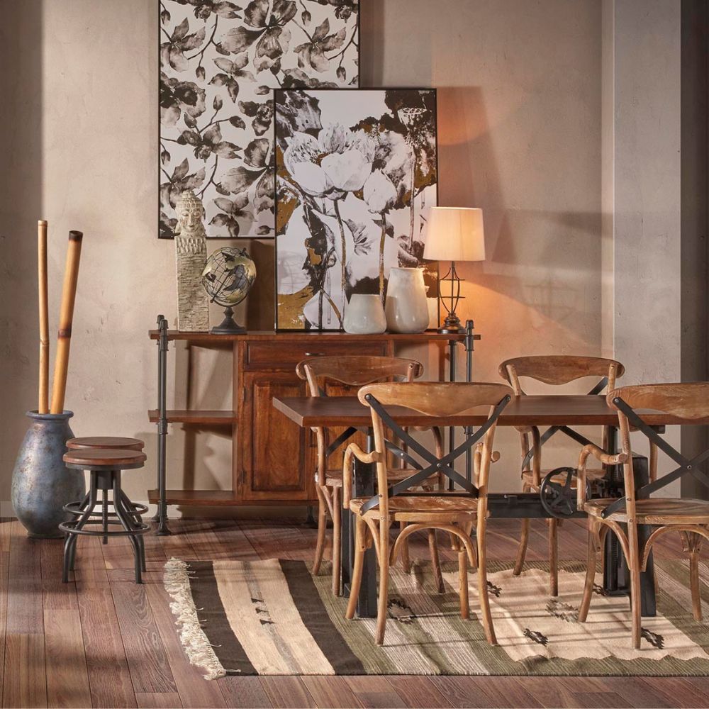 El bufet Pipa es una pieza robusta y elegante que combina funcionalidad y diseño industrial en su máxima expresión. Fabricado en madera maciza de mango y estructura de hierro, su estética se inspira en la maquinaria tradicional de taller, aportando carácter, solidez y un estilo atemporal a cualquier espacio.