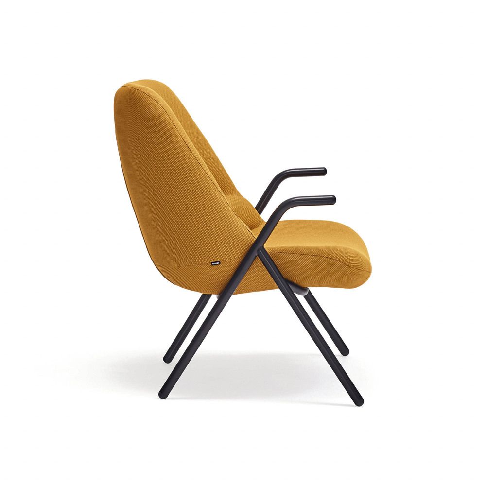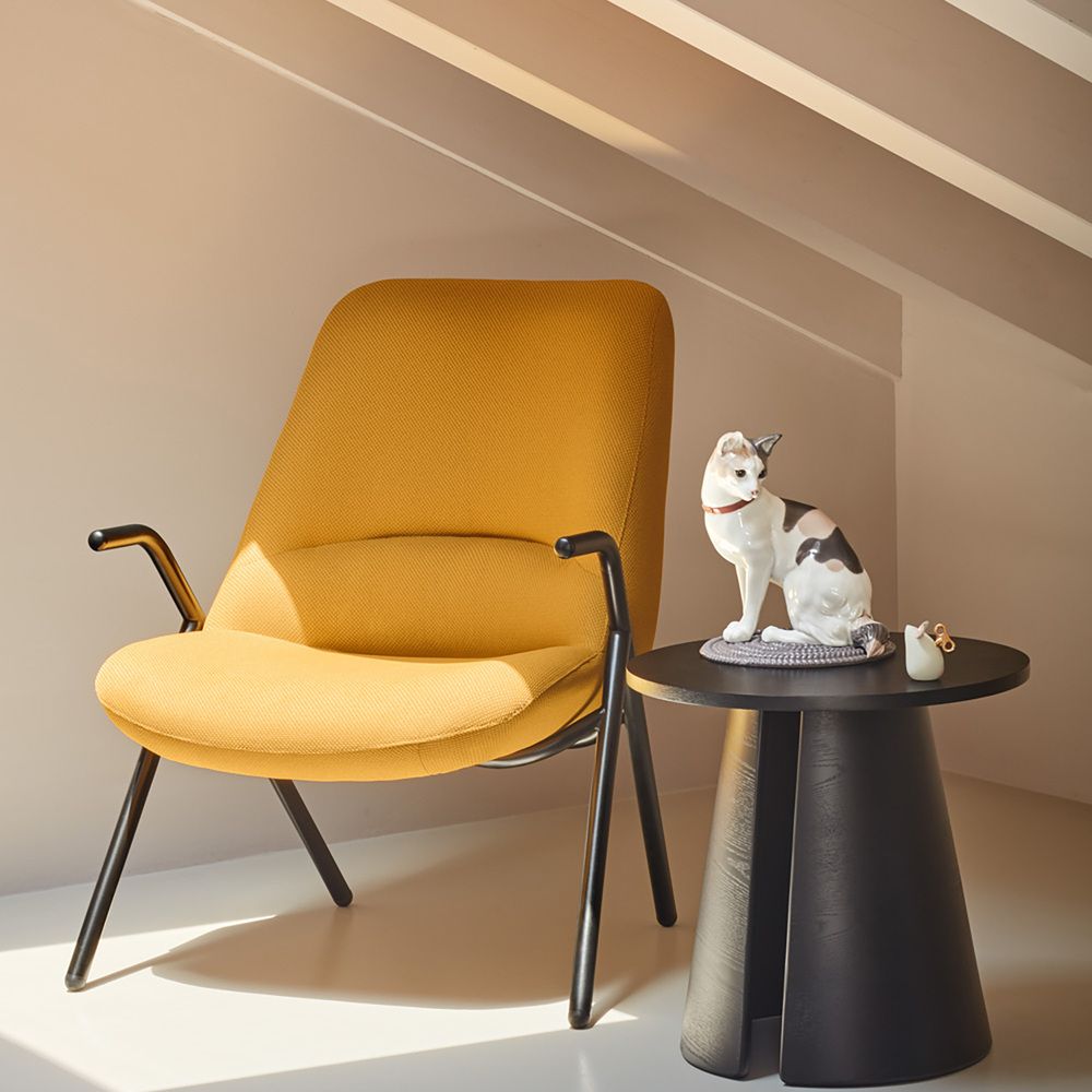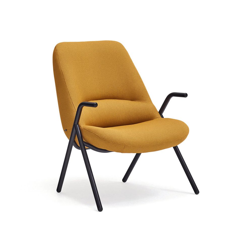 Butaca en color mostaza tapizada con Rondo de Gabriel y pata metálica.