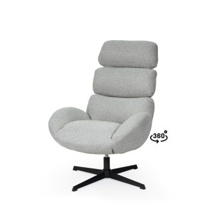 Tapizada en un tejido de textura suave y disponible en tres tonos versátiles —beige, gris y taupe—, se integra con facilidad en interiores modernos, clásicos o nórdicos. La base metálica negra, robusta y estilizada, incorpora un mecanismo giratorio de 360º que suma practicidad sin sacrificar estilo.