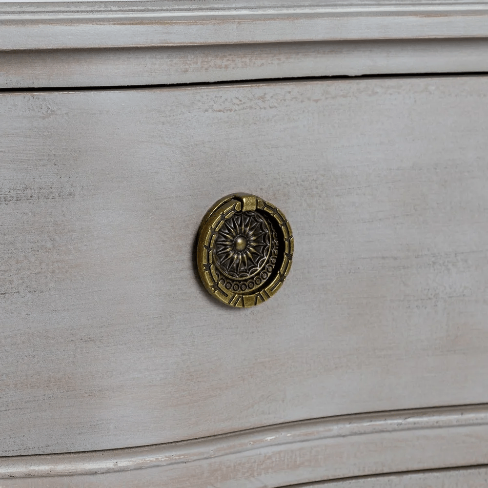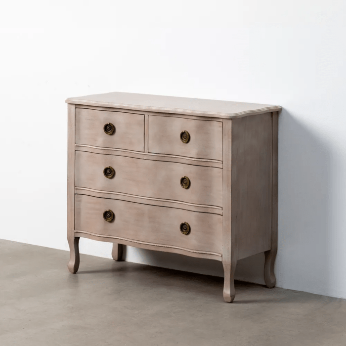 Aporta estilo y practicidad a tu hogar con esta cómoda fabricada en madera de abeto y MDF, materiales que garantizan durabilidad y resistencia. Su acabado en tono marrón claro resalta su diseño elegante y atemporal, ideal para dormitorios, salones o entradas con un aire clásico o vintage.