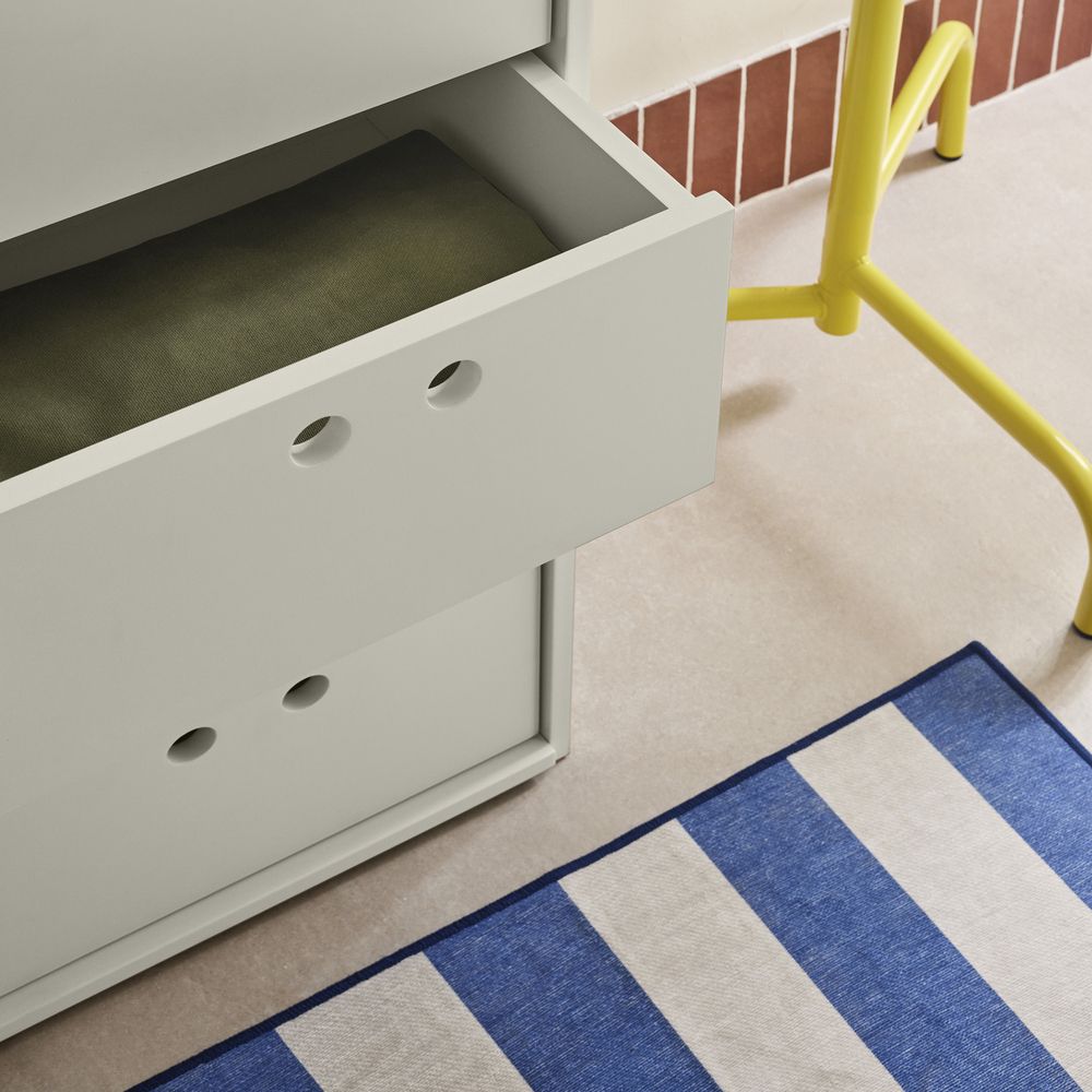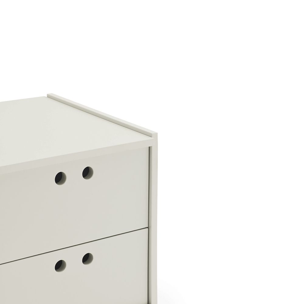 MDF visto como material de la colección. Agujeros en lugar de pomos. Superficies divisibles para facilitar el transporte y el empaquetado.