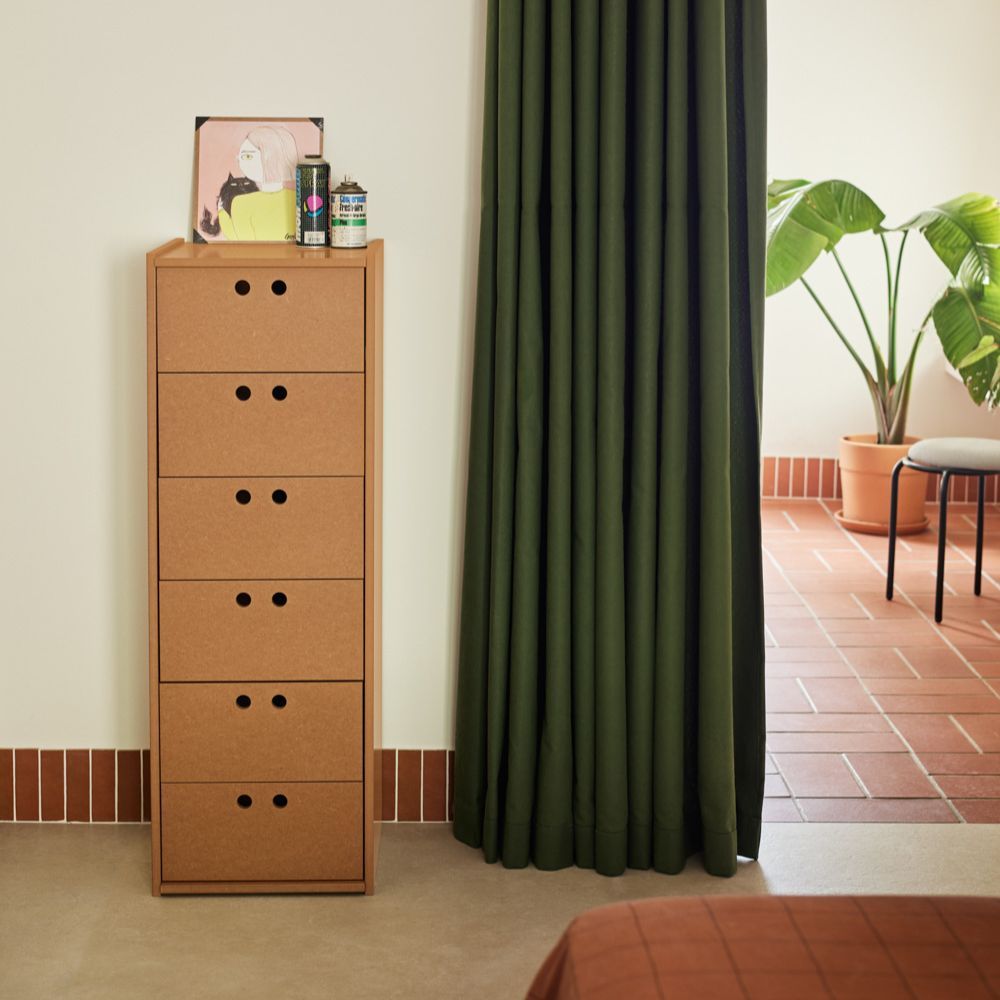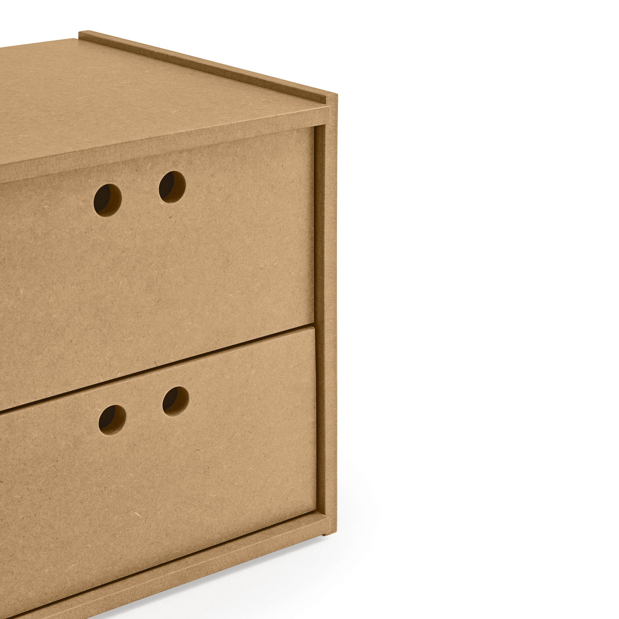 MDF visto como material de la colección. Agujeros en lugar de pomos. Superficies divisibles para facilitar el transporte y el empaquetado.