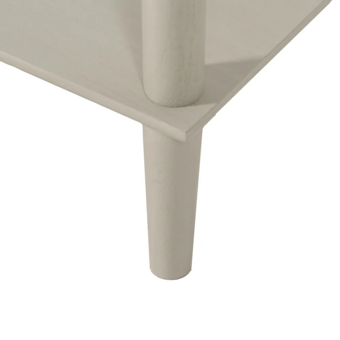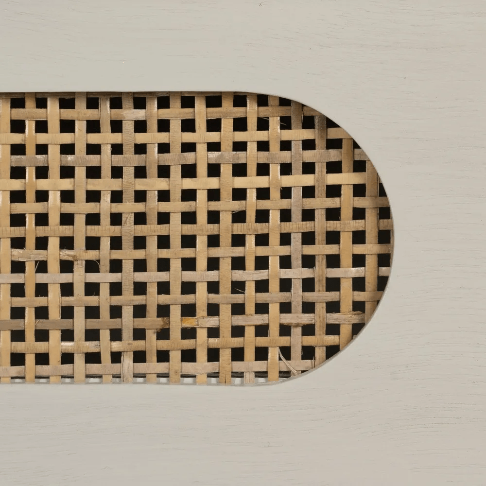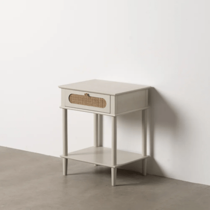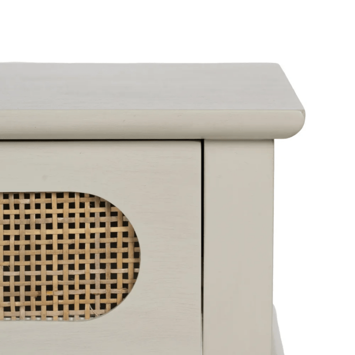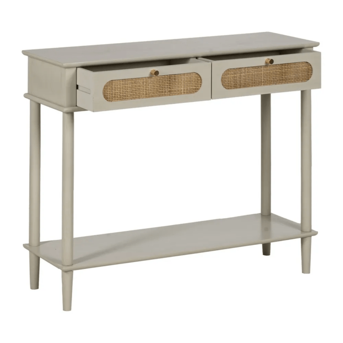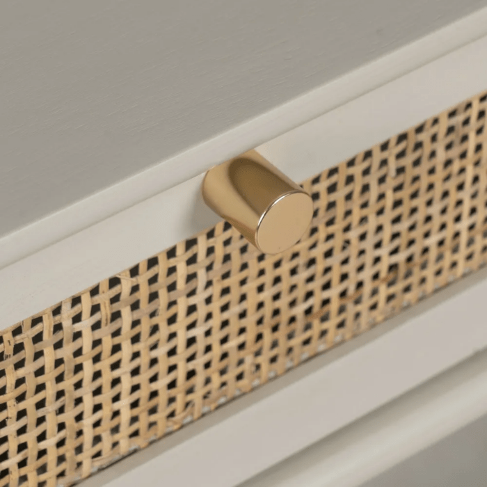 El diseño incluye dos cajones frontales con frente de rejilla decorativa y tiradores metálicos en dorado, que combinan funcionalidad con un toque sofisticado. Cada cajón mide 37 x 11 cm, ofreciendo espacio para guardar pequeños objetos y mantener el orden en casa. Además, cuenta con una balda inferior ideal para colocar cestas, libros o elementos decorativos.