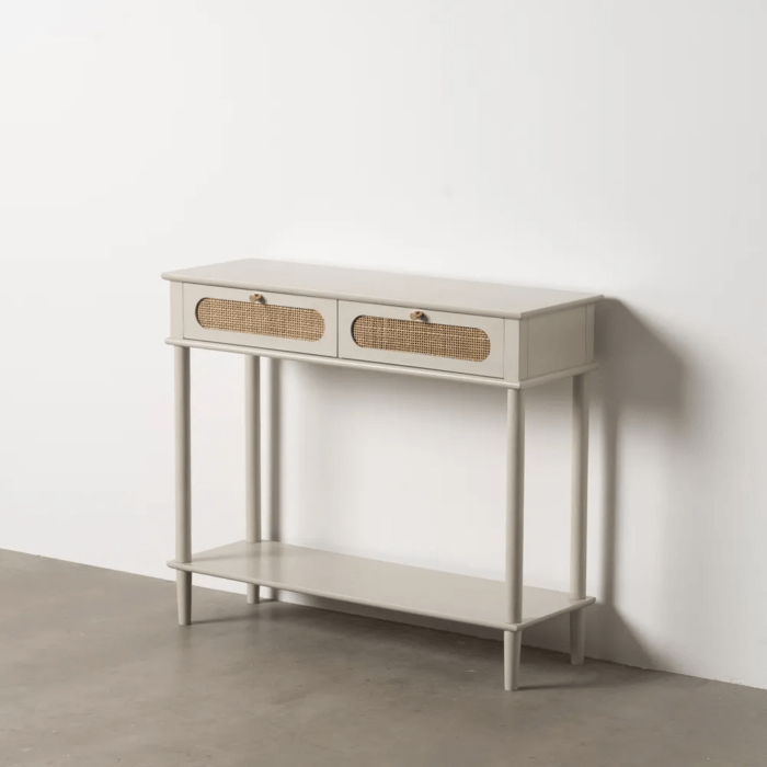 Añade elegancia y practicidad a tu recibidor, salón o dormitorio con esta consola fabricada en MDF de alta calidad. Su acabado en color gris claro aporta un estilo moderno y versátil, perfecto para integrarse en diferentes ambientes decorativos.