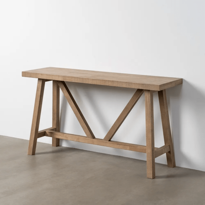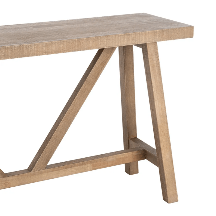 Aporta un toque de elegancia natural y estilo contemporáneo a tu hogar con esta consola fabricada en madera de caucho. Su diseño de líneas limpias y estructura en forma de “A” con refuerzos diagonales crea una pieza robusta y visualmente equilibrada, ideal para complementar cualquier estancia.
