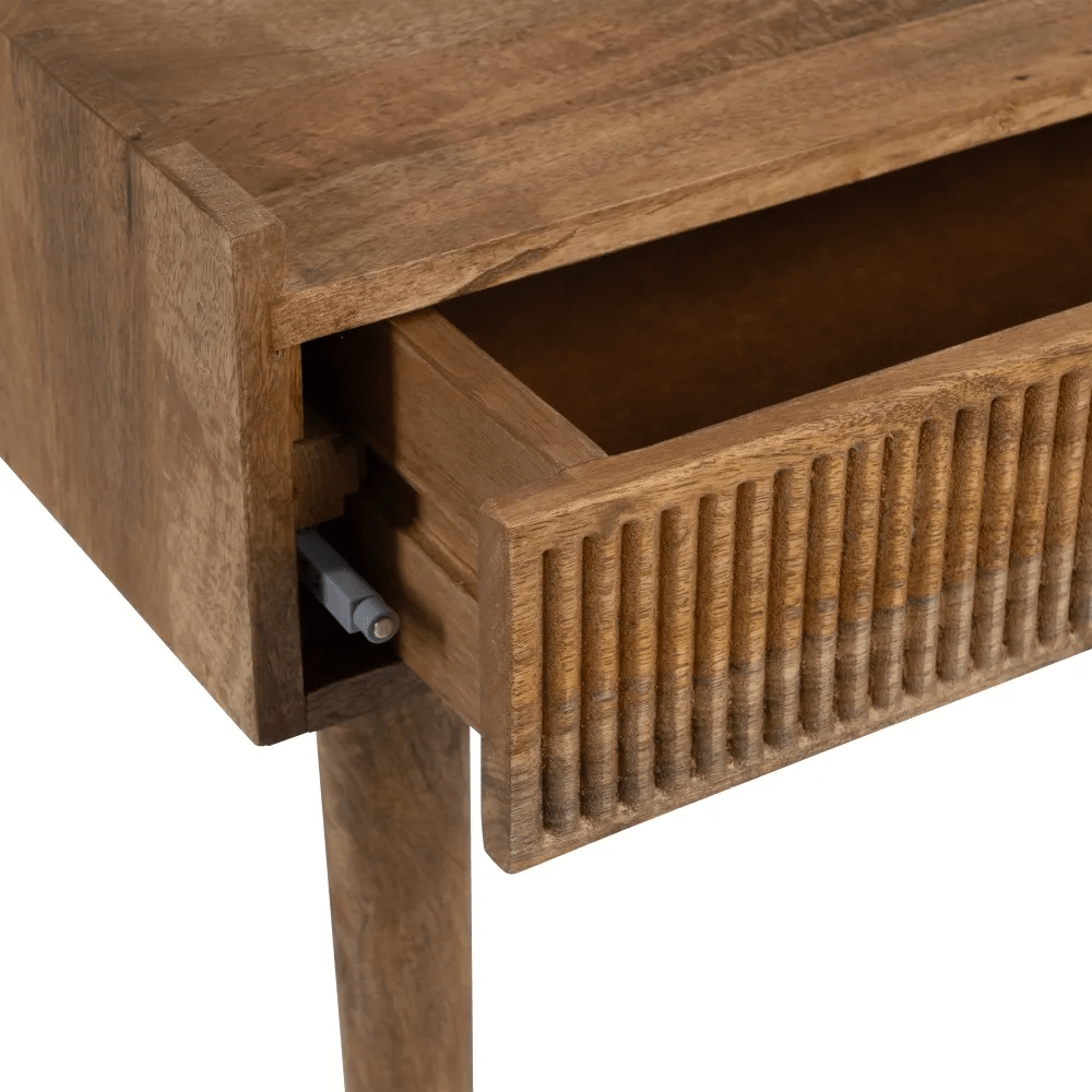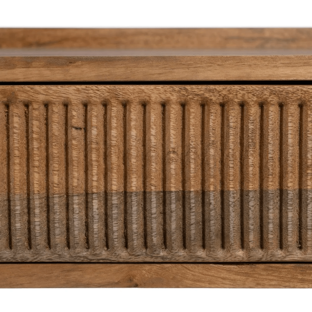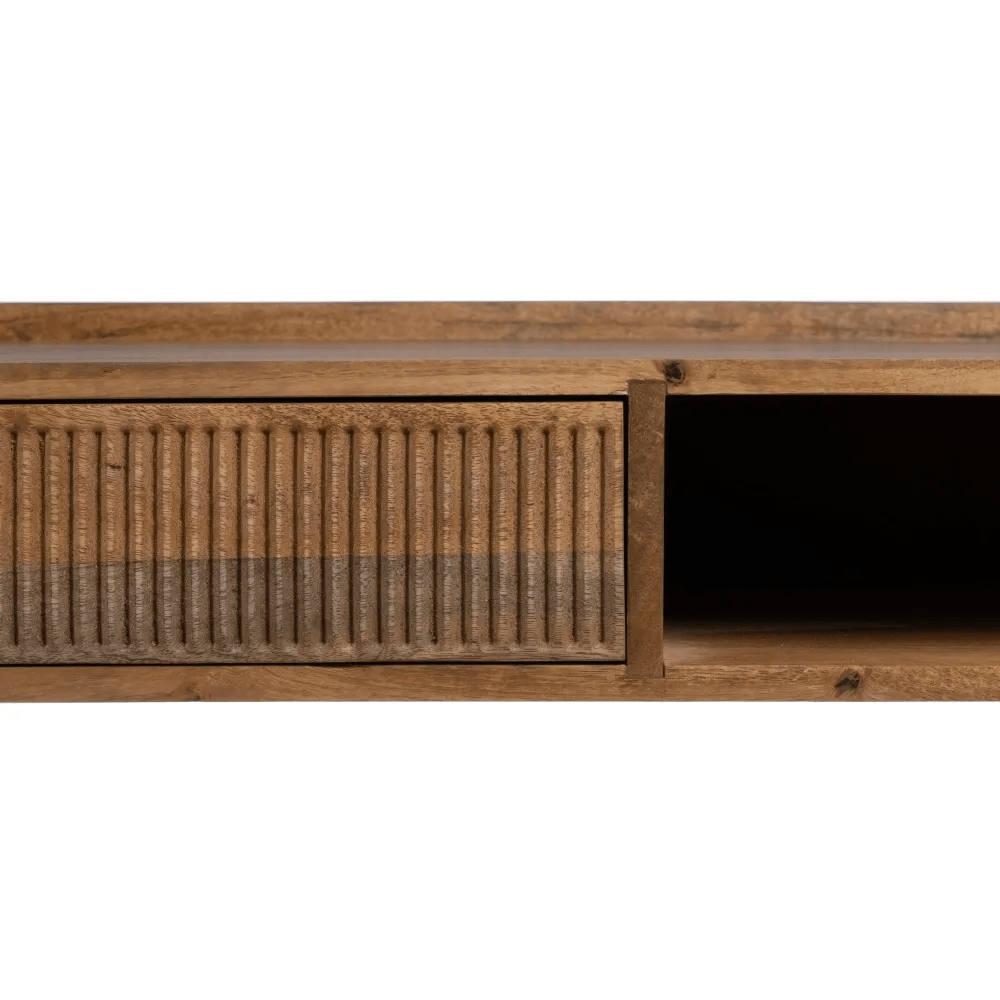 Su estructura incluye un cajón con frontal acanalado que ofrece un toque artesanal y una textura única, junto con un hueco abierto perfecto para guardar libros, documentos o accesorios de oficina. El cajón mide 52 x 42 x 10,5 cm, mientras que el hueco abierto tiene unas dimensiones de 53,5 x 11 cm, ofreciendo un espacio práctico y bien organizado.