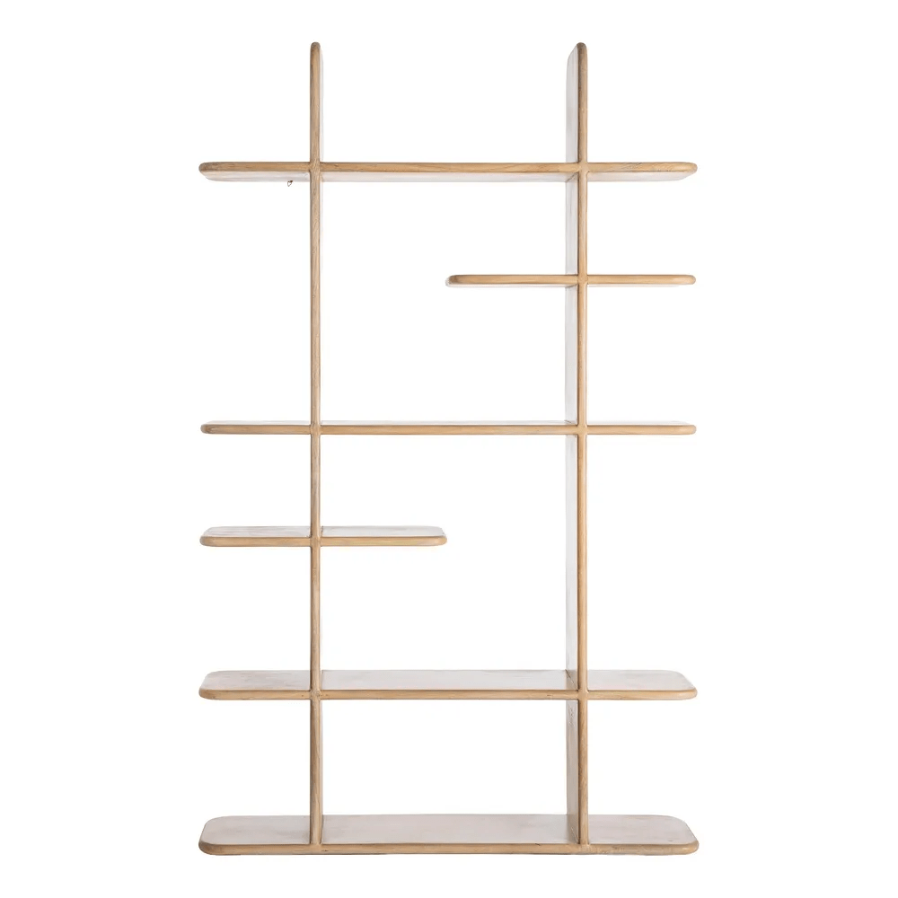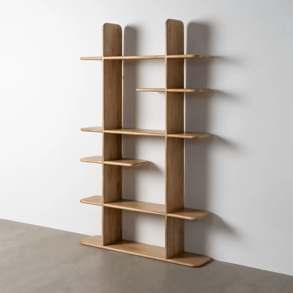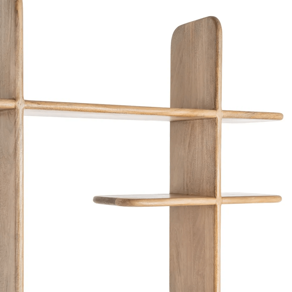 La estantería Asana está elaborada en madera de mango maciza con acabado natural, destacando por su diseño contemporáneo y líneas orgánicas. Su estructura abierta y equilibrada crea un juego visual ligero, ideal para aportar calidez y estilo a cualquier espacio.