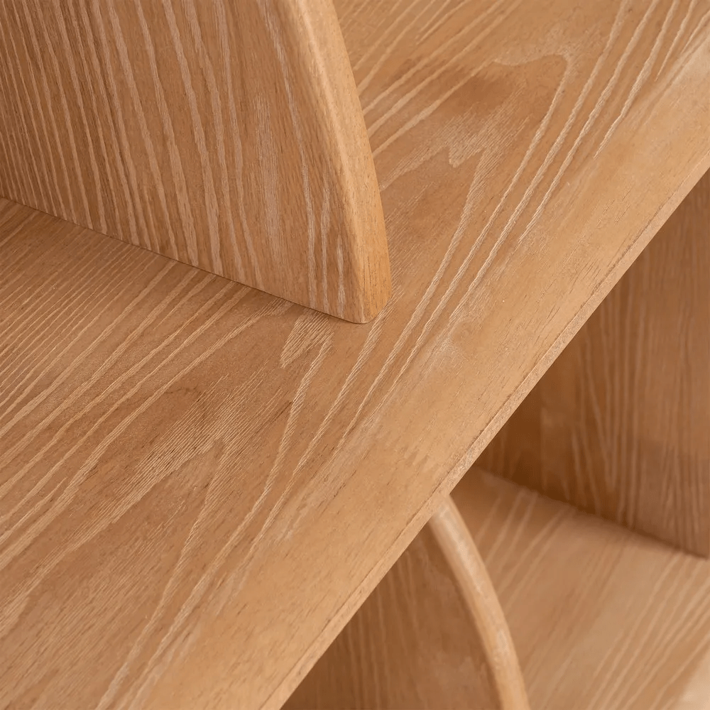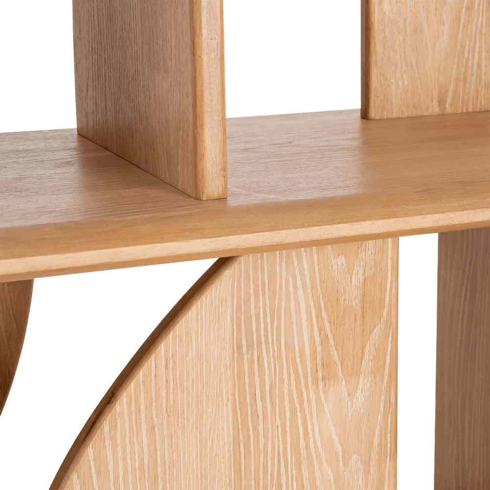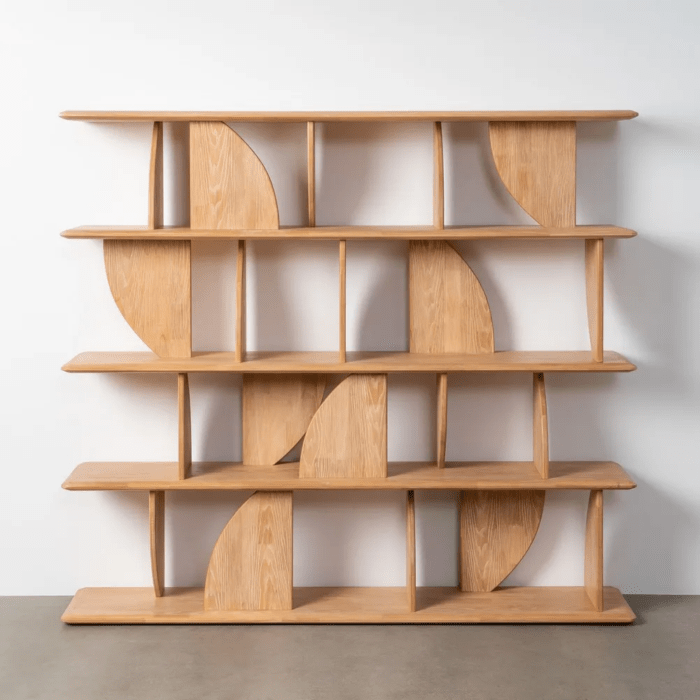 Esta elegante estantería en color natural, fabricada en madera de caucho, combina diseño moderno y funcionalidad en una pieza única. Su estructura de líneas curvas y rectas crea un juego visual equilibrado, ideal para realzar cualquier espacio con un estilo contemporáneo y cálido.
