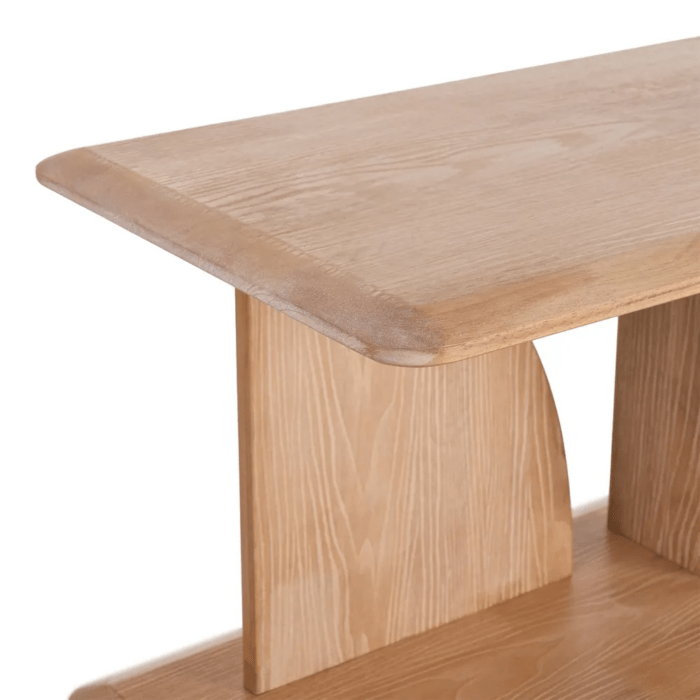 Con unas dimensiones de 180 x 38 x 83 cm (ancho x fondo x alto), ofrece amplios espacios de almacenaje distribuidos en tres niveles, perfectos para colocar libros, objetos decorativos o plantas. Su acabado natural realza la belleza de la madera, aportando calidez y armonía al ambiente.