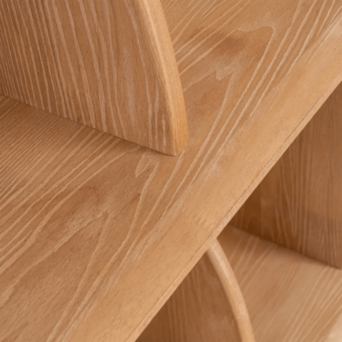 Esta elegante estantería en color natural, fabricada en madera de caucho, combina funcionalidad y diseño moderno en una sola pieza. Su estructura robusta y sus líneas curvas aportan un toque original y contemporáneo, ideal para destacar en cualquier estancia del hogar.