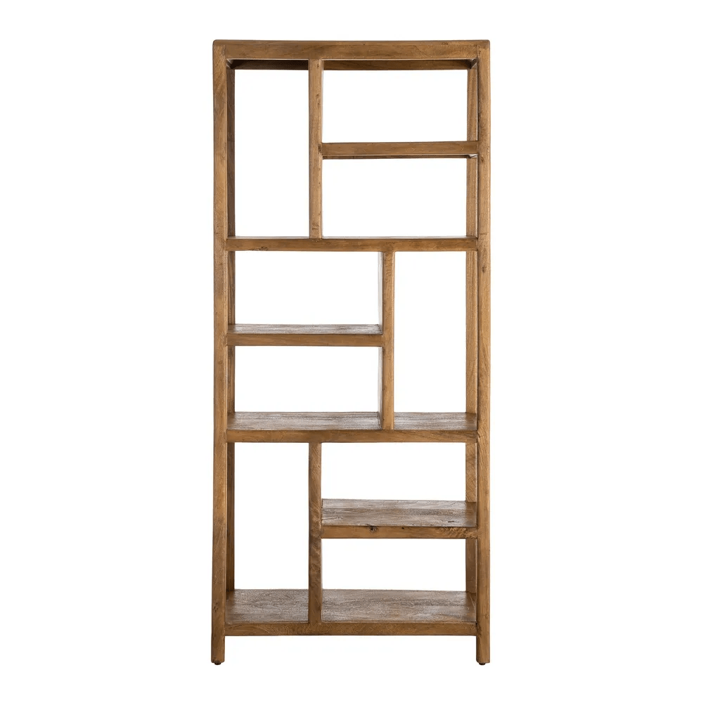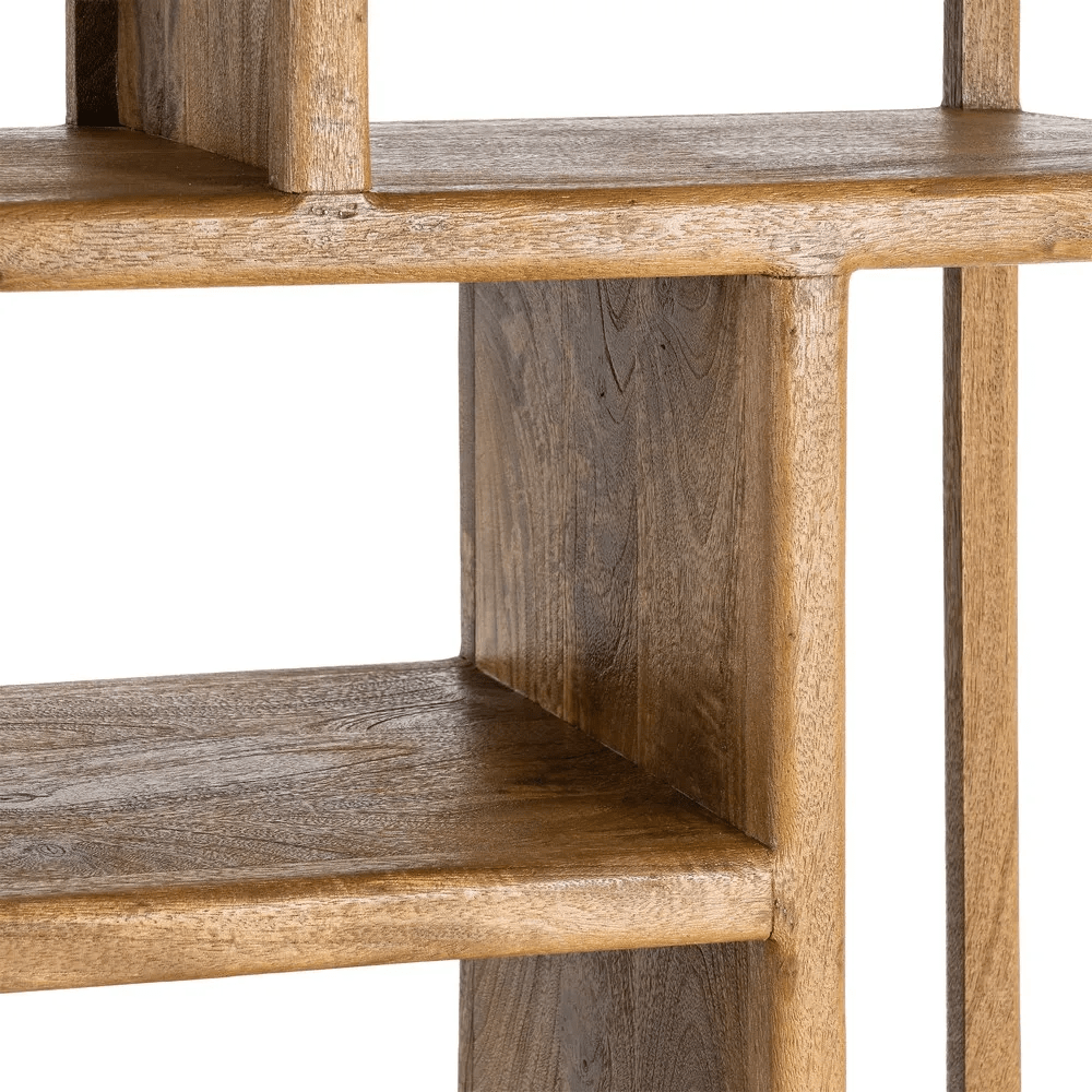 Estantería de madera de mango en acabado natural, una pieza funcional y decorativa que aporta calidez y personalidad a cualquier espacio. Su diseño abierto con compartimentos asimétricos crea un atractivo juego visual, ideal para exhibir libros, objetos decorativos, plantas o cestas de almacenaje.