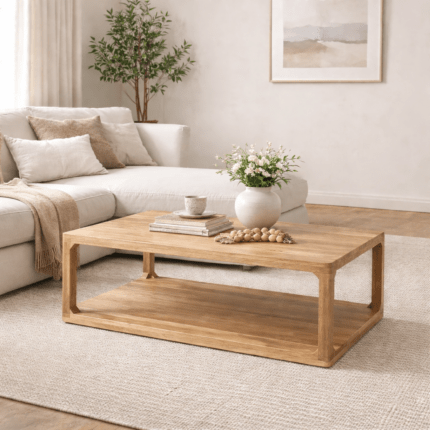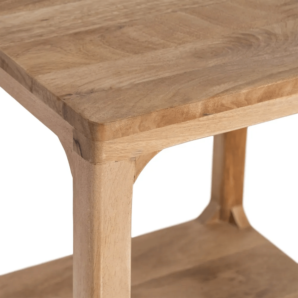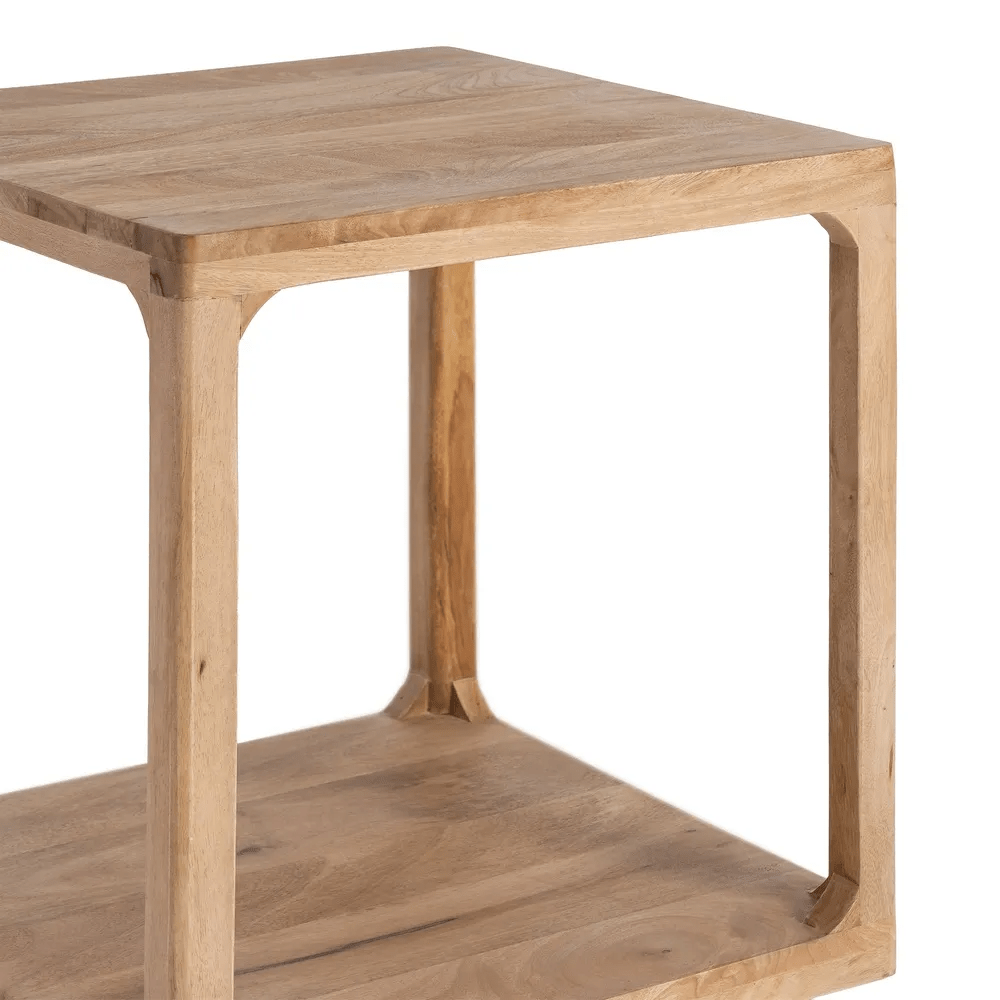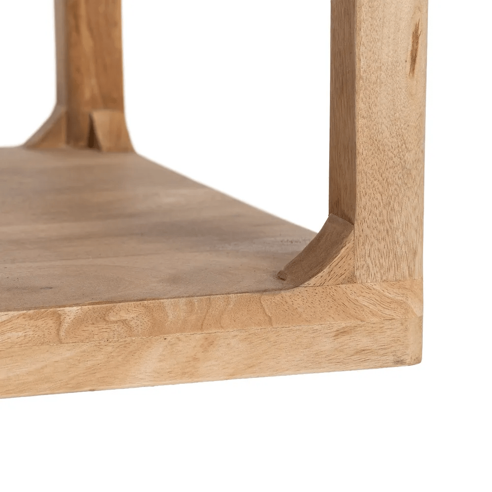 Su diseño abierto con balda inferior la convierte en una opción práctica y versátil, perfecta como mesa auxiliar junto al sofá, mesa de noche o apoyo decorativo en salones y dormitorios. Las esquinas suavemente redondeadas realzan el trabajo artesanal de la madera y aportan un toque sofisticado y acogedor.