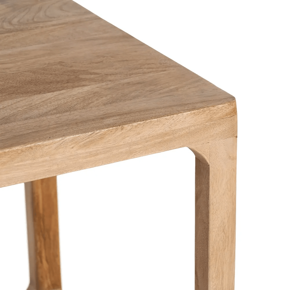 La mesa auxiliar Asana es una pieza que combina diseño contemporáneo y calidez natural. Fabricada en madera maciza de mango con acabado en color natural, destaca por sus líneas limpias y su estructura cúbica, que aporta equilibrio y ligereza visual a cualquier espacio.