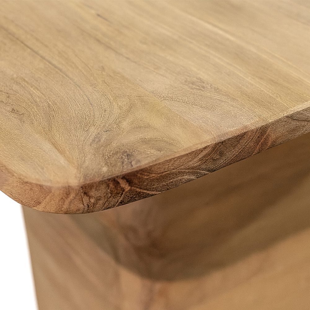La mesa auxiliar EYRE es una pieza versátil y decorativa que destaca por su diseño limpio y sus formas suaves. Elaborada a mano en madera maciza de teca, muestra la belleza natural de este material, con vetas únicas y un acabado cálido que aporta carácter a cualquier estancia.