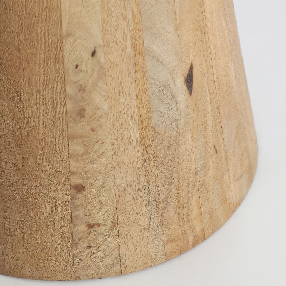 Mesa auxiliar en color marrón y blanco fabricada en madera de mango, combinado con terrazo.