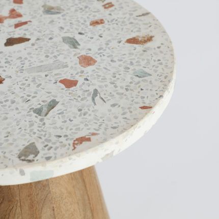 Mesa auxiliar en color marrón y blanco fabricada en madera de mango, combinado con terrazo.